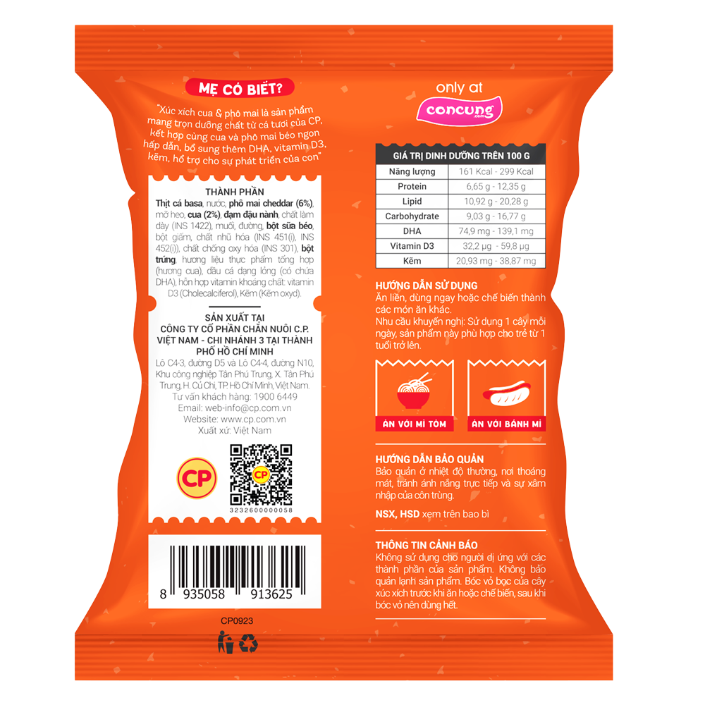 | Thành phần | Thịt cá basa, nước, phô mai cheddar (6%), mỡ heo, cua (2%), đạm đậu nành, chất làm dày (INS 1422), muối, đường, bột sữa béo, bột giấm, chất nhũ hóa (INS 451(i), INS 452(i)), chất chống oxy hóa (INS 301), bột trứng, hương liệu thực phẩm tổng hợp (hương cua), dầu cá dạng lỏng (có chứa DHA), hỗn hợp vitamin khoáng chất: vitamin D3 (Cholecalciferol), Kẽm (Kẽm oxyd). |