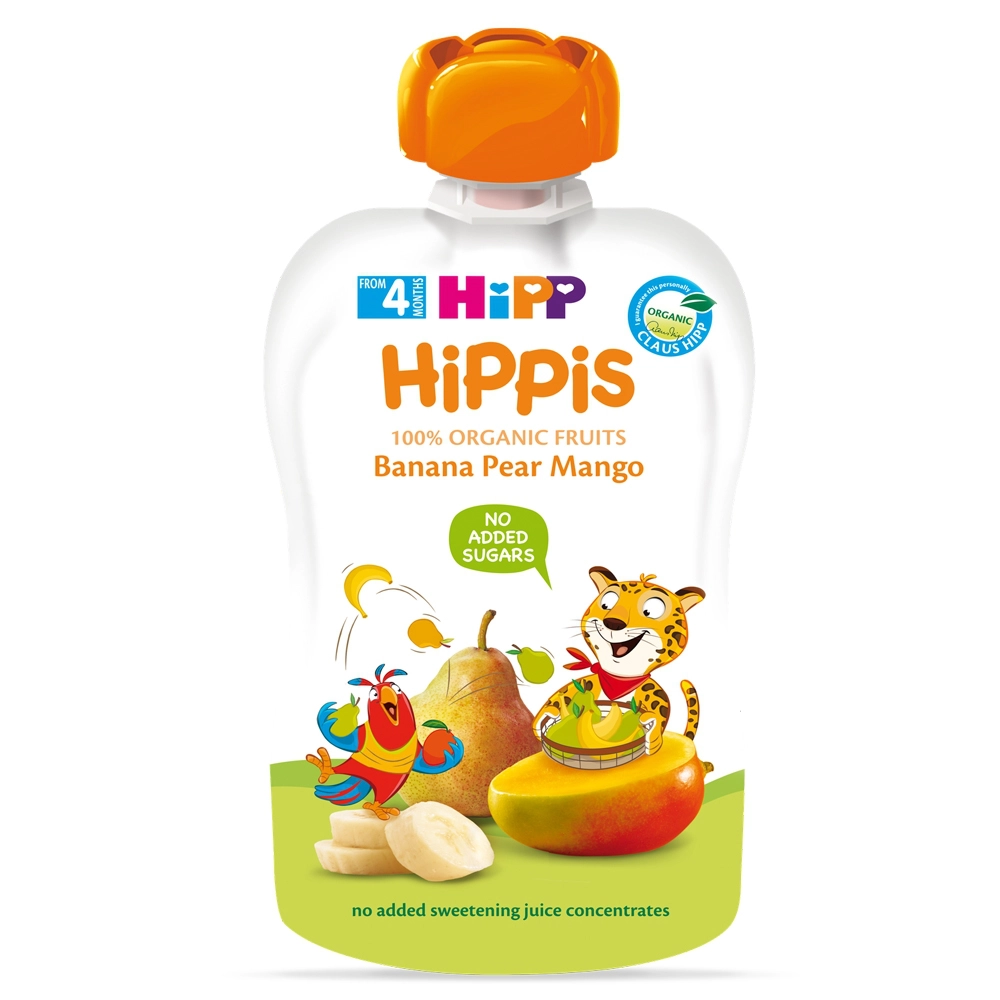 - Dinh dưỡng 100% trái cây nghiền hữu cơ HiPPiS Organic (Chuối, Lê, Xoài) với thành phần từ trái cây 100% (chuối 52%, lê 30%, xoài 15%, nước chanh), đây là một gợi ý dinh dưỡng rất phù hợp cho bé yêu.