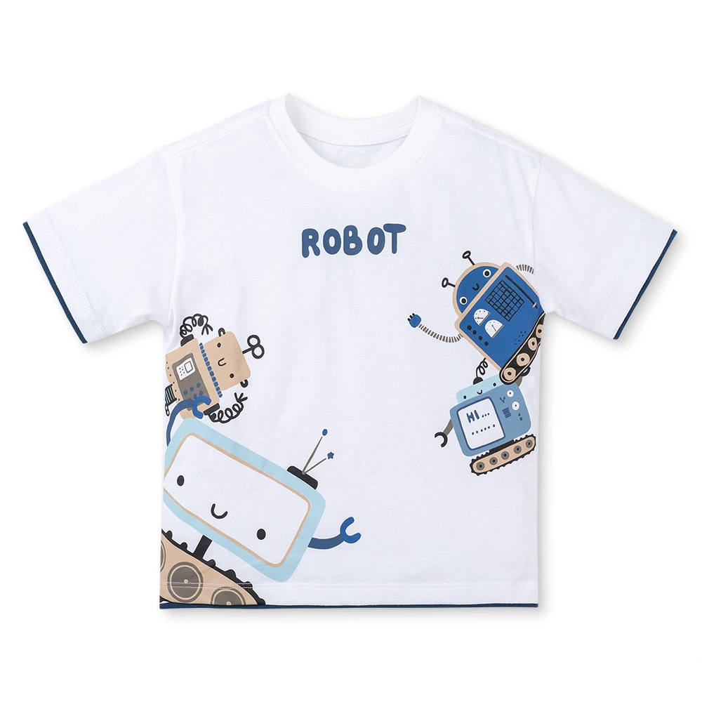 - Họa tiết Robot sinh động: Điểm nhấn của áo là hình in các chú Robot nhiều màu sắc (xanh, nâu) cùng dòng chữ "ROBOT" ngộ nghĩnh, kích thích trí tưởng tượng và sự thích thú của bé.