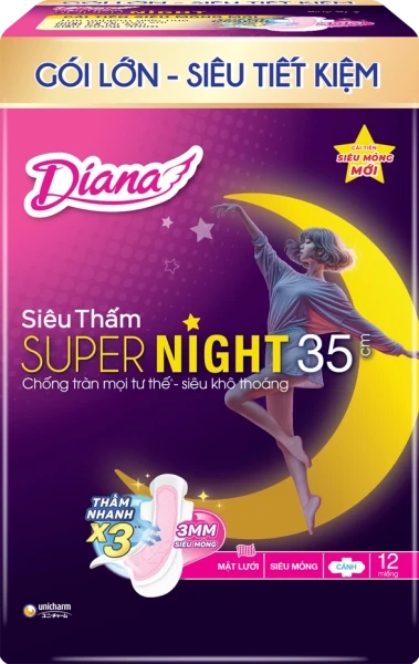 Băng vệ sinh ban đêm Diana siêu thấm Supernight 35cm (12 miếng) mang đến sự an tâm trọn đêm với thiết kế siêu mỏng 3mm thoáng khí, lõi thấm siêu tốc và hệ thống chống tràn toàn diện, giúp nàng ngủ ngon, thoải mái trong mọi tư thế mà không lo hầm bí hay tràn sau.