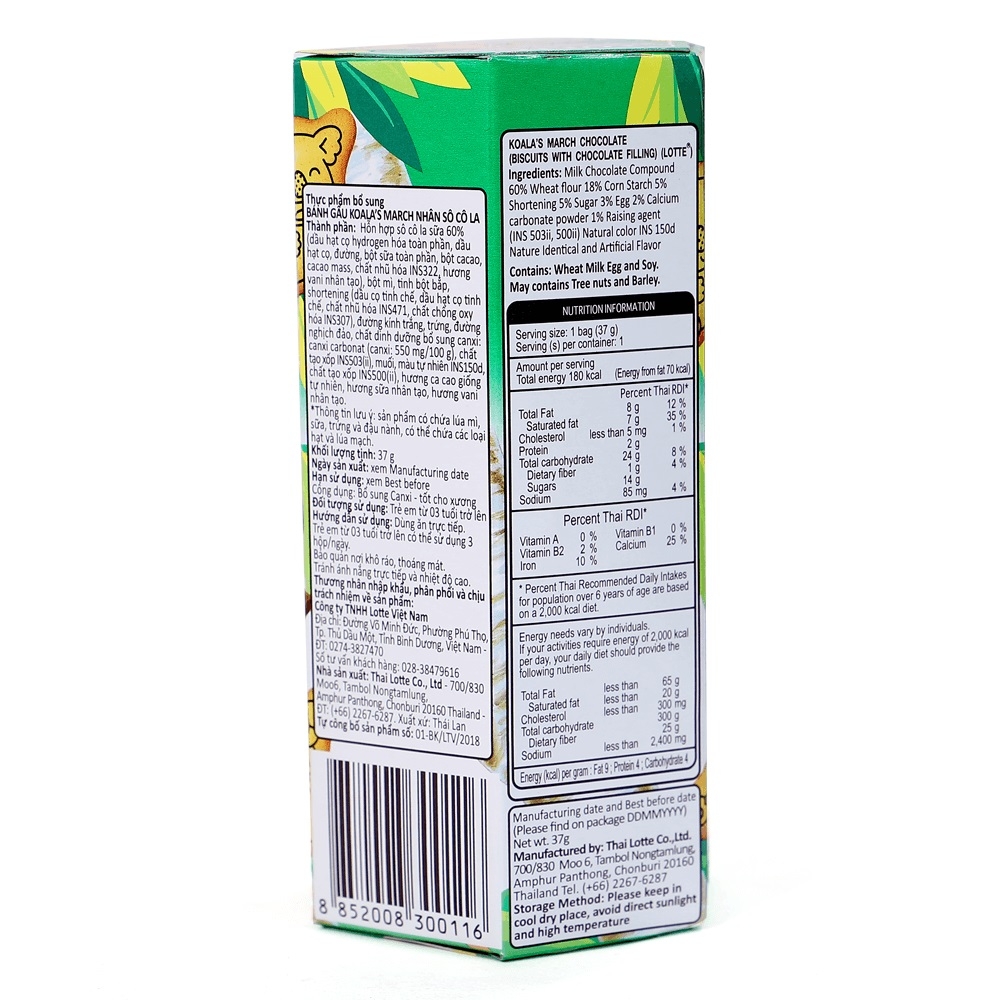 Thành phần: Hỗn hợp sô cô la sữa 60% (dầu hạt cọ hydrogen hóa toàn phần, dầu hạt cọ, đường, bột sữa toàn phần, bột cacao, cacao mass, chất nhũ hóa INS322, hương vani nhân tạo), bột mì, tinh bột bắp, shortening (dầu cọ tinh chế, dầu hạt cọ tinh chế, chất nhũ hóa INS471, chất chống oxy hóa INS307), đường kính trắng, trứng, đường nghịch đảo, chất dinh dưỡng bổ sung canxi: canxi carbonat (canxi: 550 mg/100 g), chất tạo xốp INS503(ii), muối, màu tự nhiên INS150d, chất tạo xốp INS500(ii), hương cacao giống tự nhiên, hương sữa nhân tạo, hương vani nhân tạo.