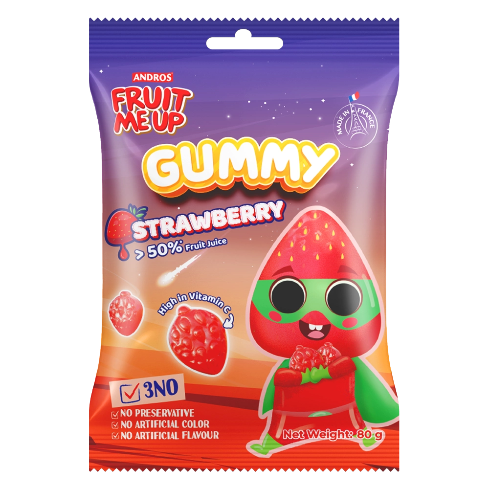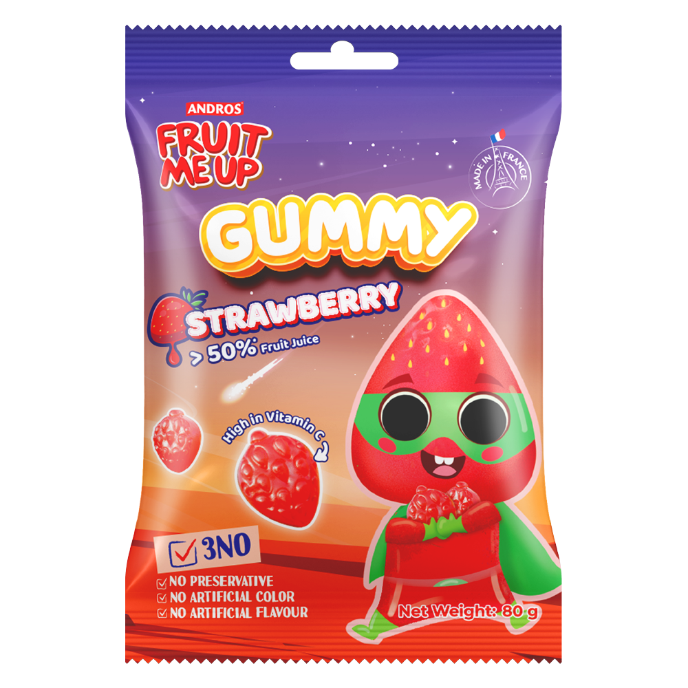 Kẹo dẻo Fruit Me Up Gummy hình dáng quả dâu, hương vị thơm ngon, chua ngọt tự nhiên, bổ sung vitamin C giúp tăng cường đề kháng và mang đến niềm vui nhâm nhi mỗi ngày.