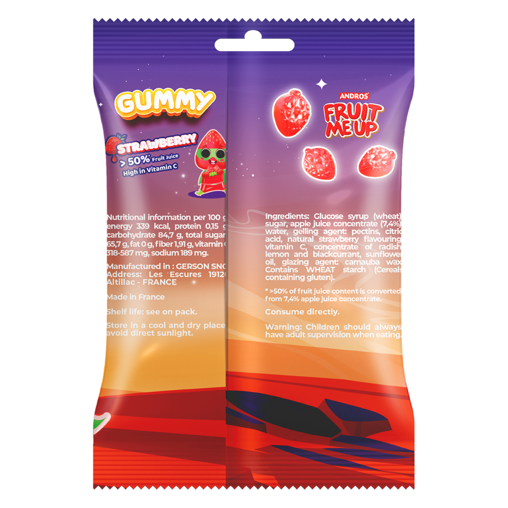 Thành phần | Siro glucose ( Lúa Mì), đường , nước ép cô đặc ( 7,4%, nước, chất tạo gel ( pectin), chất điều chỉnh độ axit ( 330), hương liệu dâu tự nhiên , VitaminC, nước ép cô đặc, ( củ cải, chanh và lý chua đen), dầu hướng dương, dầu làm bóng (903) |