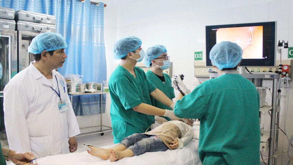 Bác sĩ Đồng Xuân Sắc (ngoài cùng, bên trái) và đồng nghiệp thực hiện ca nội soi tiêu hóa gây mê cho bệnh nhi (Nguồn: Internet)