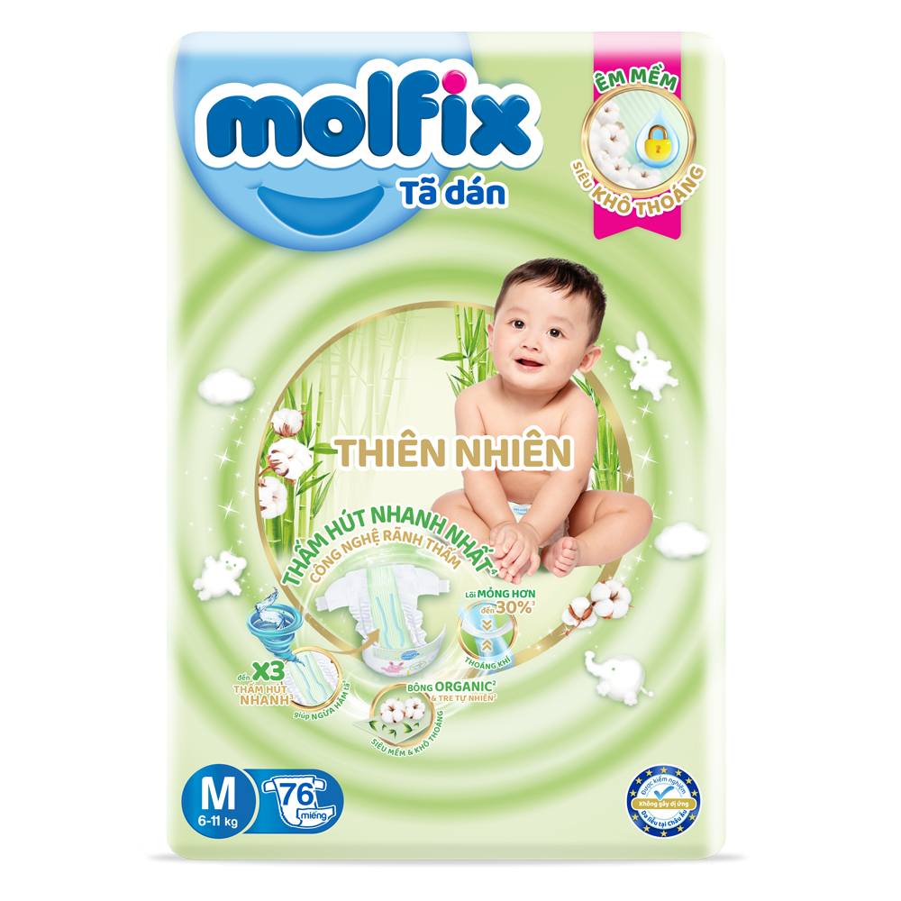 | Tên sản phẩm | Bỉm tã dán Molfix Thiên Nhiên (M, 6-11kg, 76 miếng + 8 miếng) |