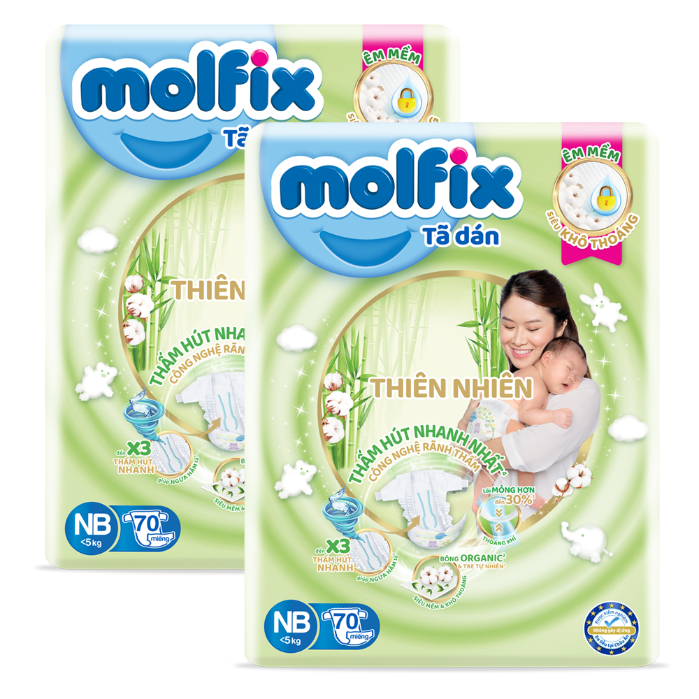 Combo 2 Bỉm tã dán Molfix thiên nhiên (Newborn,< 5kg, 70 miếng) (giao mẫu ngẫu nhiên)