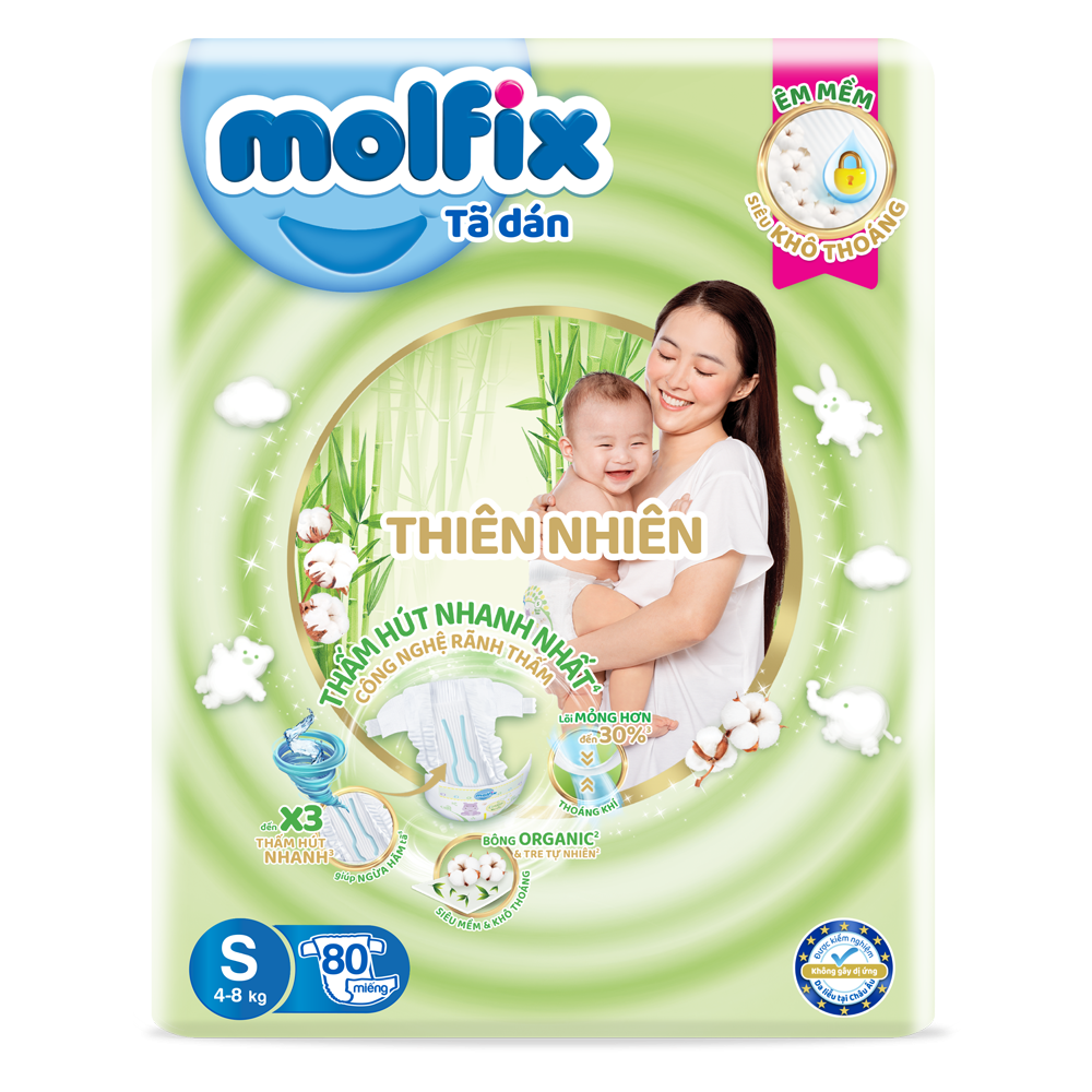 | Tên sản phẩm | Bỉm tã dán Molfix Thiên Nhiên (S, 4-8kg, 80 miếng + 8 miếng) |