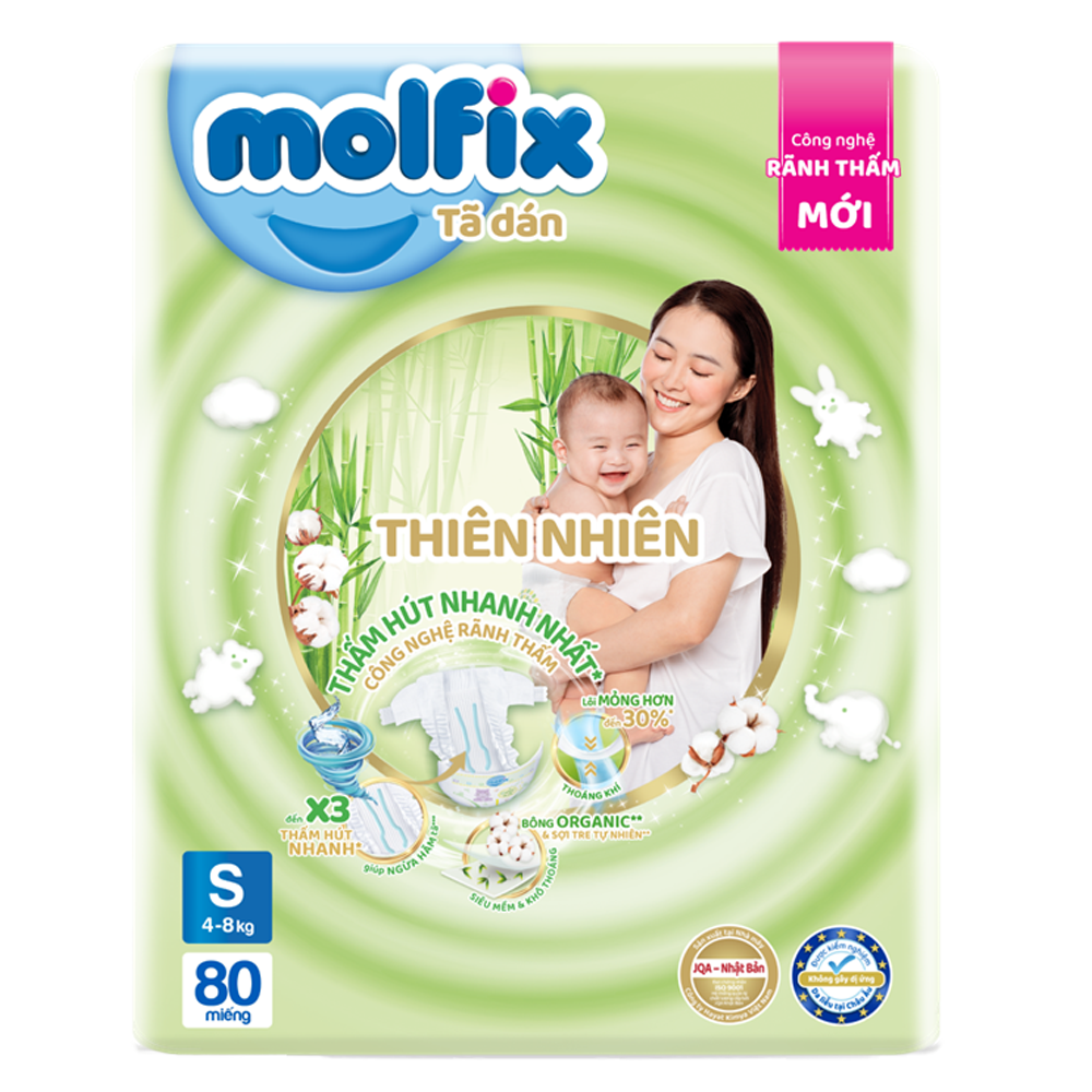 Bỉm tã dán Molfix Thiên Nhiên (S, 4-8kg, 80 miếng + 8 miếng) là sản phẩm dành cho trẻ có cân nặng 4 - 8kg. Với thành phần sợi tre tự nhiên và bông Organic, Molfix Thiên Nhiên là dòng sản phẩm đột phá từ nhà sản xuất tã trẻ em lớn thứ 5 thế giới dành riêng cho thị trường Việt Nam, đồng thời được công ty mẹ Hayat Việt Nam đầu tư dây chuyền sản xuất ngay tại Bình Phước để mang tới dòng tã chất lượng quốc tế, giá thành nội địa đáp ứng nhu cầu của các gia đình Việt. Ưu điểm nổi bật . Thấm hút thần tốc: Với 5.000 lỗ thấm hút thần kỳ, sản phẩm được tăng khả năng hút chất lỏng vào bên trong nhanh chóng, giữ bề mặt miếng lót luôn khô thoáng.