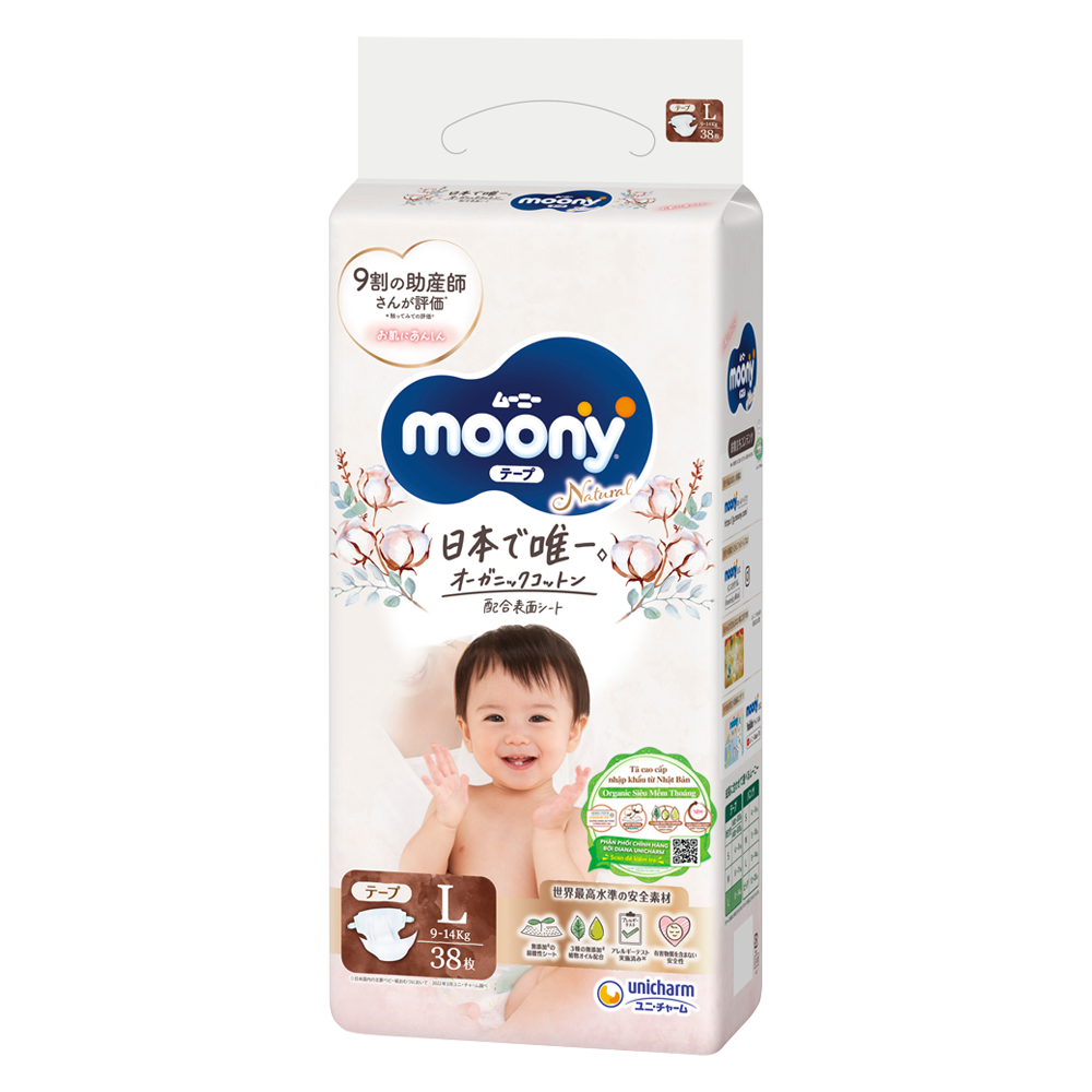 Bỉm tã dán Moony Natural size L 38 miếng là dòng sản phẩm dành cho bé từ 9-14kg của thương hiệu Moony đến từ tập đoàn Unicharm Nhật Bản. Tã siêu cao cấp Moony Natural với cải tiến vượt bậc, sử dụng bề mặt Bông hữu cơ đầu tiên tại Nhật Bản.