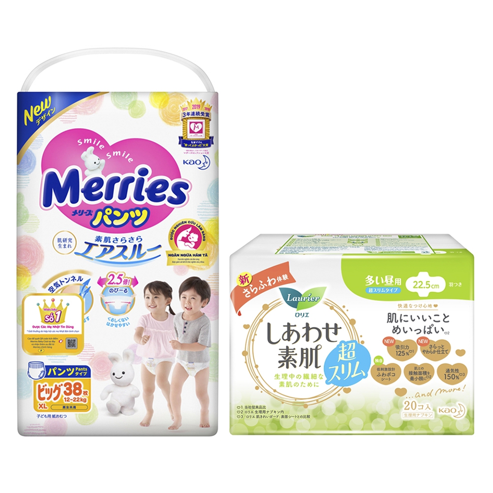 Combo 1 Bỉm tã quần Merries size XL 38 miếng và 1 Băng vệ sinh ngày Laurier siêu mỏng (22.5cm)