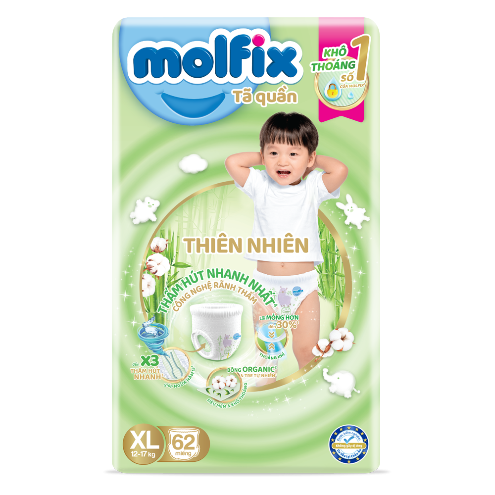 | Tên sản phẩm | Bỉm tã quần Molfix Thiên Nhiên (XL, 12-17kg, 62 miếng) |