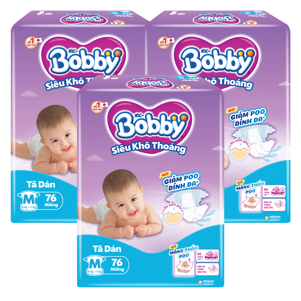 Combo 3 gói Bỉm tã dán Bobby siêu thấm size M 76 miếng (6-10kg) (giao bao bì ngẫu nhiên)