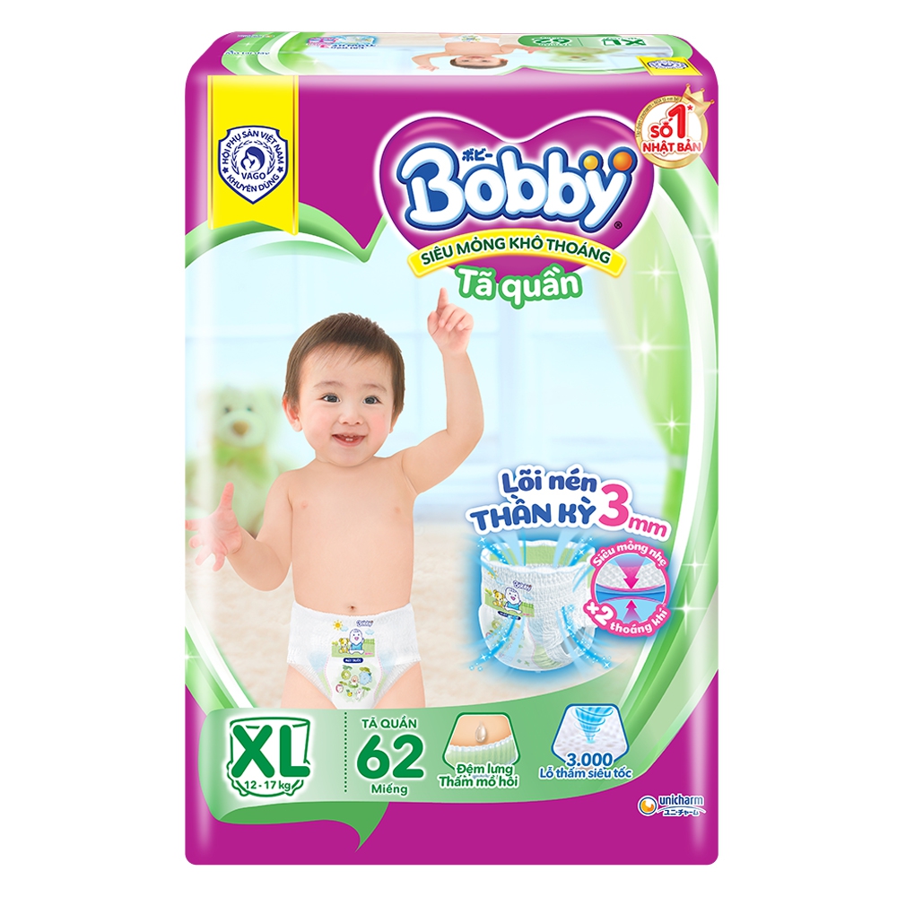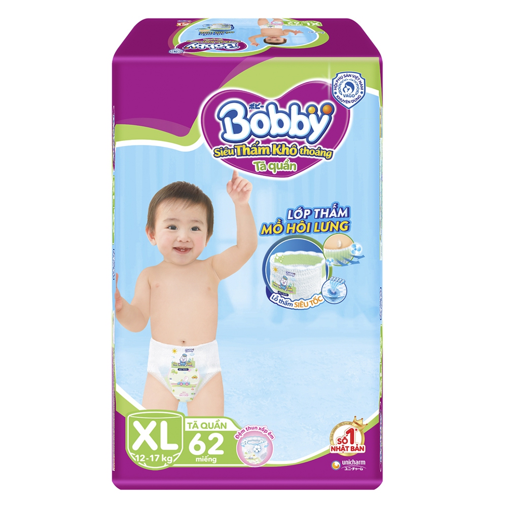 Bỉm tã quần Bobby size XL 62 miếng là sản phẩm bỉm tã dành cho bé từ 12-17kg thuộc thương hiệu Bobby đến từ tập đoàn Unicharm Nhật Bản. Sản phẩm là sự lựa chọn tốt nhất mà mẹ dành cho bé yêu trong những tháng năm đầu đời.