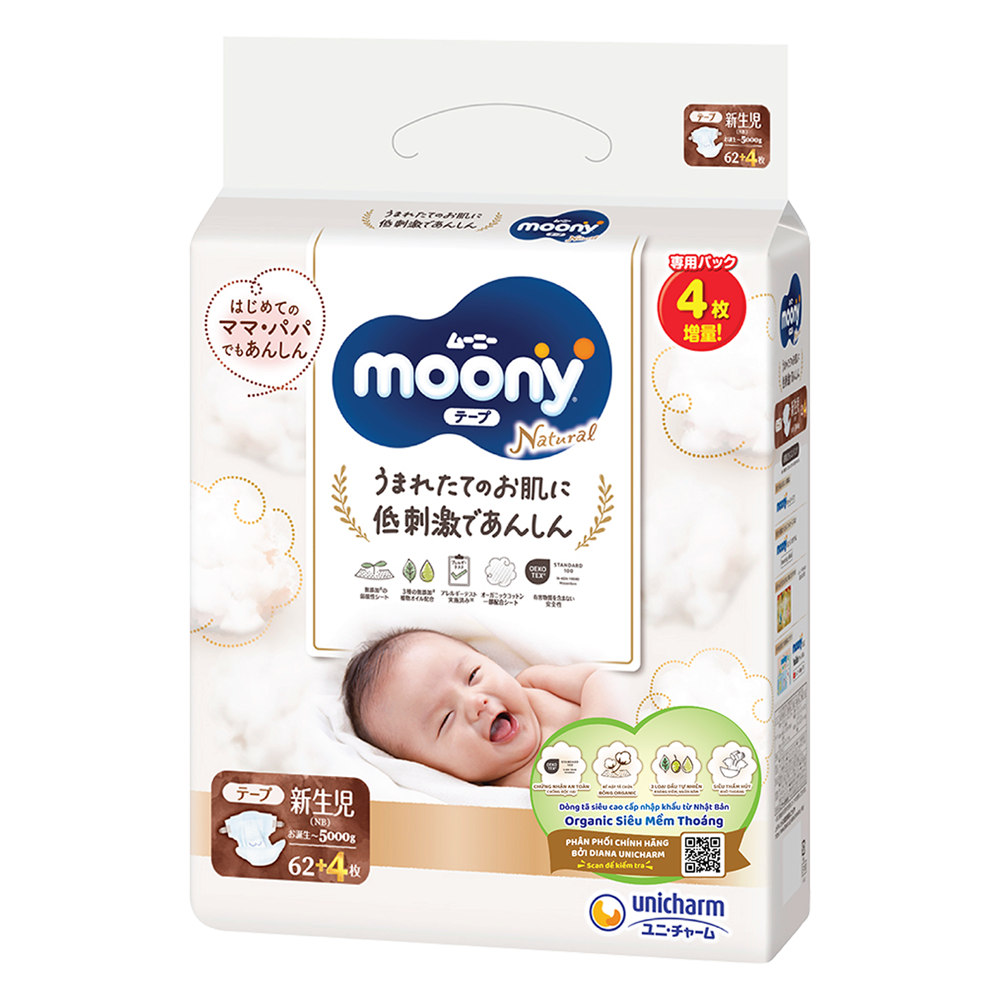 | Tên sản phẩm | Tã dán Moony Natural / Moony Dịu nhẹ (NB, 62 miếng + 4 miếng) |