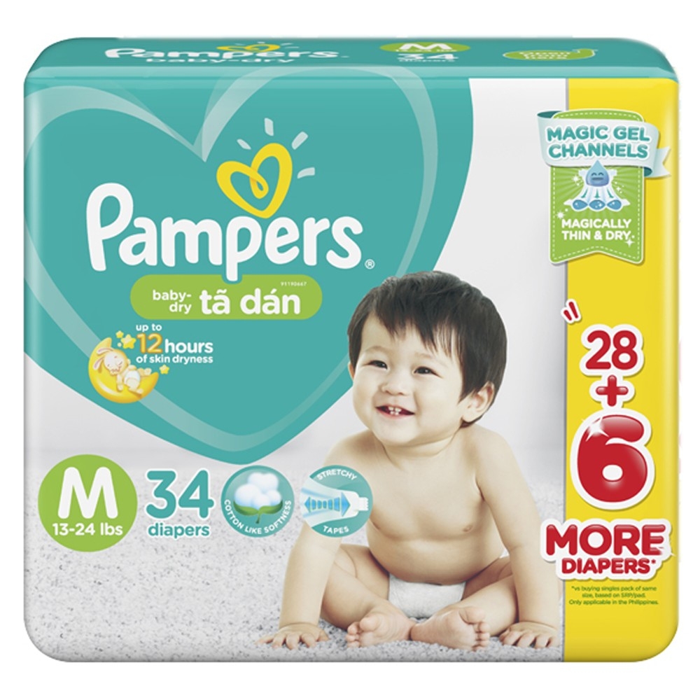 - Tã dán pampers Nhập khẩu M 34 miếng với phần lõi chứa lớp gel "thần kỳ" cùng lớp vải đặc biệt ngăn không cho thấm ngược trở lại, giúp da bé luôn được khô thoáng trong vòng 12 giờ, để bé có giấc ngủ ngon, đồng thời thoải mái khi vui chơi và học tập.