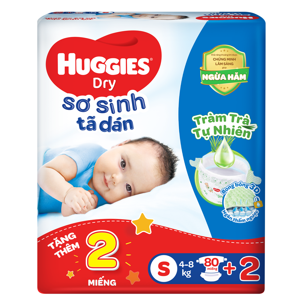 Tã dán sơ sinh Huggies Dry (S, 4-8kg, 80 miếng) + 2 miếng