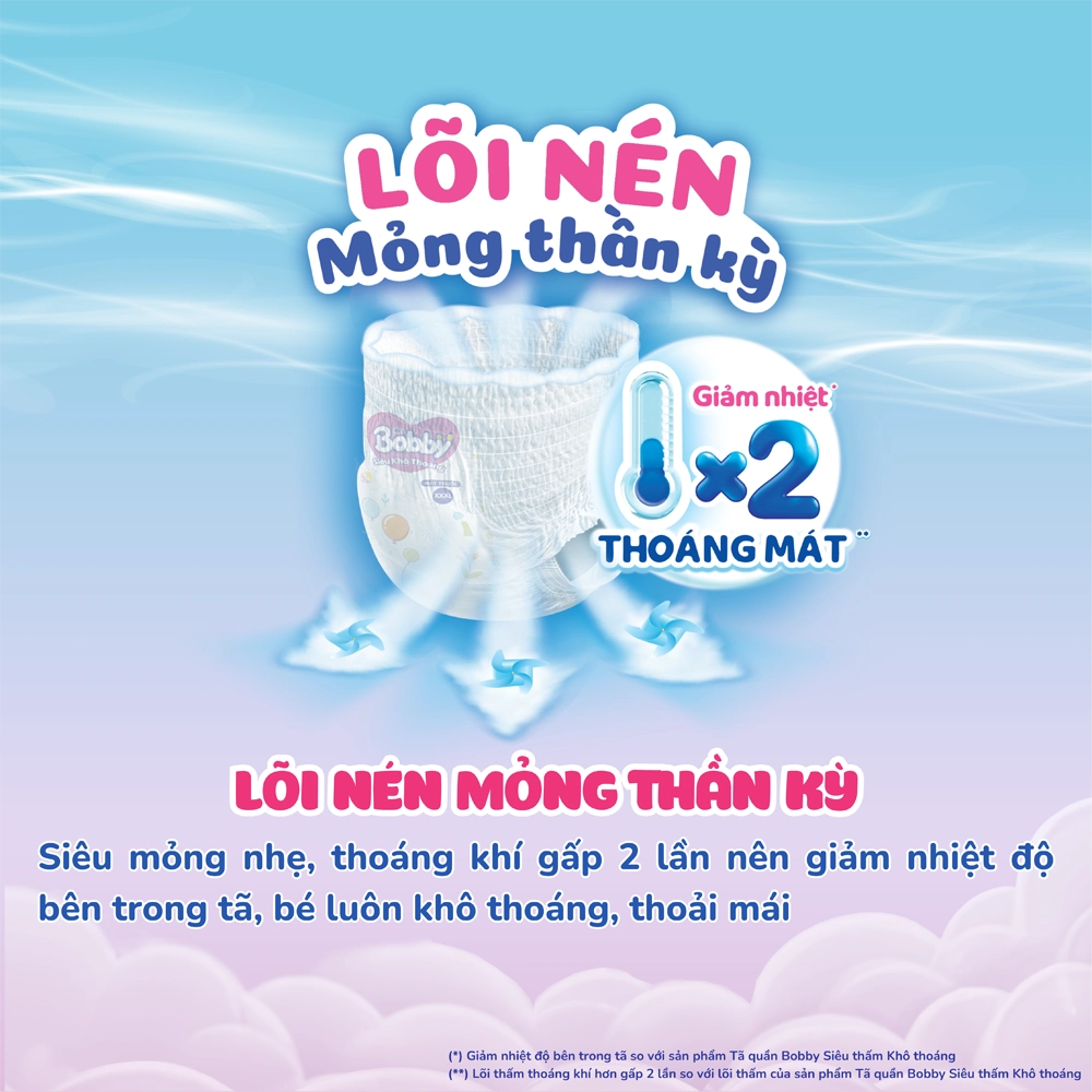 . Lõi nén mỏng thần kỳ: Siêu mỏng nhẹ, thoáng khí gấp 2 lần nên giảm nhiệt độ bên trong tã, bé luôn khô thoáng, thoải mái