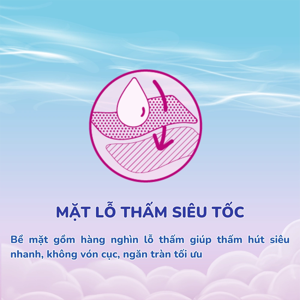 . Mặt lỗ thấm siêu tốc: Bề mặt gồm hàng nghìn lỗ thấm giúp thấm hút siêu nhanh, không vón cục, ngăn tràn tối ưu
