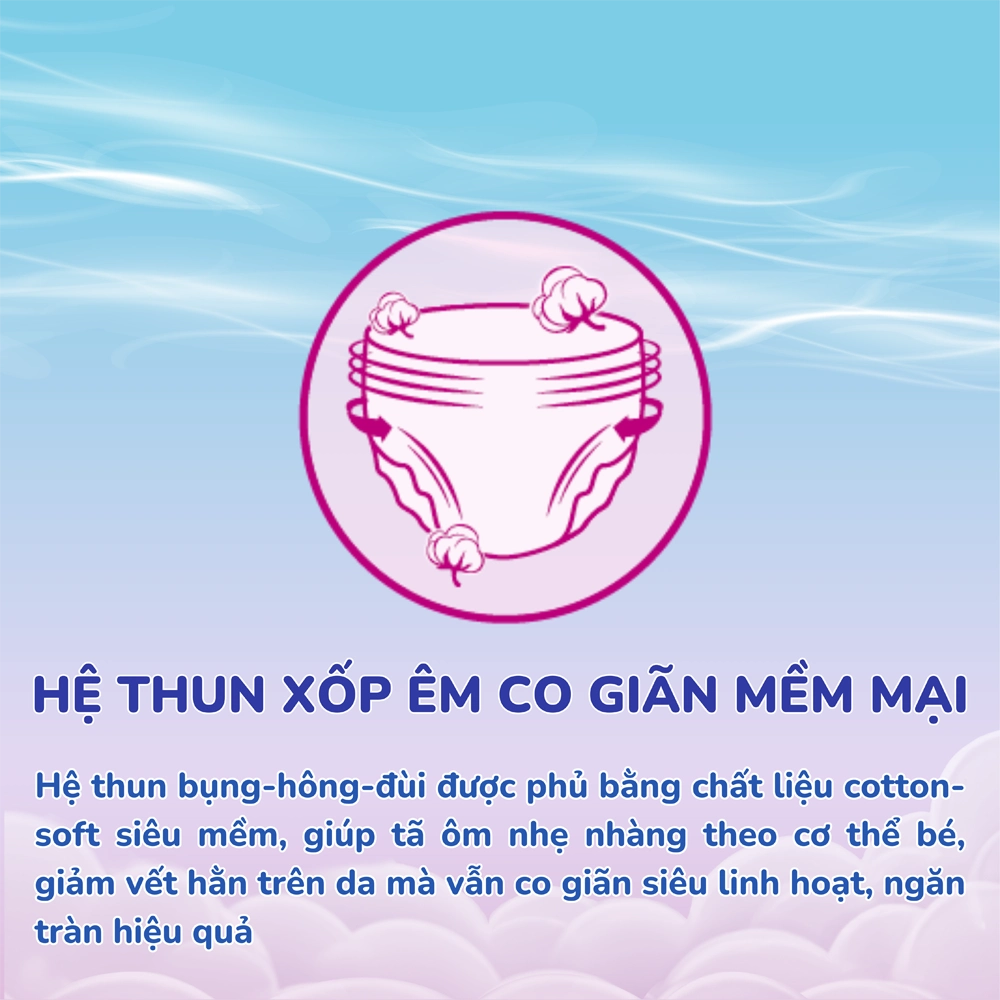 . Hệ thun xốp êm co giãn mềm mại: Hệ thun bụng-hông-đùi được phủ bằng chất liệu cotton-soft siêu mềm, giúp tã ôm nhẹ nhàng theo cơ thể bé, giảm vết hằn trên da mà vẫn co giãn siêu linh hoạt, ngăn tràn hiệu quả