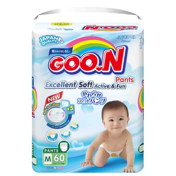 Tã Quần Goon có thiết kế tiện dụng với đai lưng mềm mại và co giãn tốt, vừa vặn ôm sát cơ thể mà không để lại vết hằn trên da bé. Tã có khả năng thấm hút tốt cùng bề mặt tã được trang trí bằng họa tiết dễ thương mang lại vẻ tinh nghịch, đáng yêu cho các bé khi mặc.
