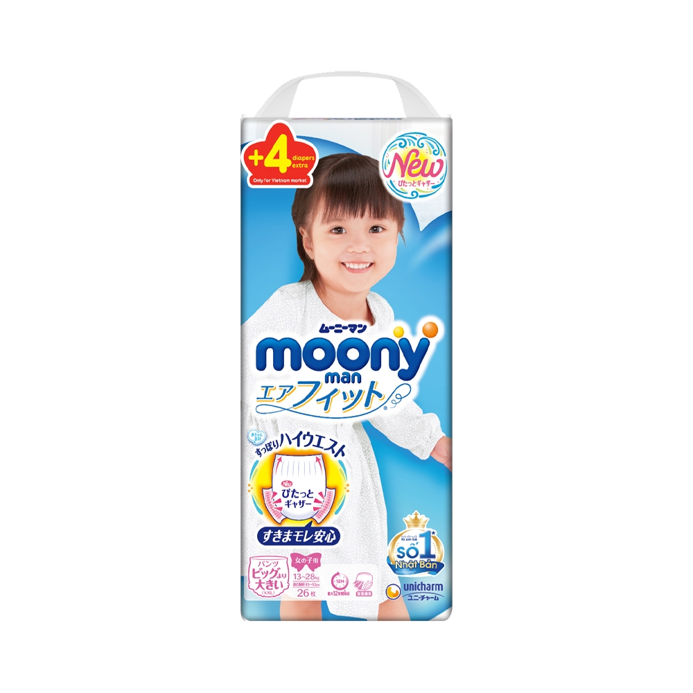 Bỉm tã quần Moony bé gái size XXL 26 miếng (+4 miếng) là loại bỉm dành cho các bé gái từ 13-28kg thuộc thương hiệu Moony nổi tiếng tại Nhật Bản, được sản xuất bởi tập đoàn Unicharm danh tiếng. Bỉm tã Moony áp dụng công nghệ hoàn toàn mới ở phần hông với màng vải thun êm mềm, co giãn tuyệt đối.
