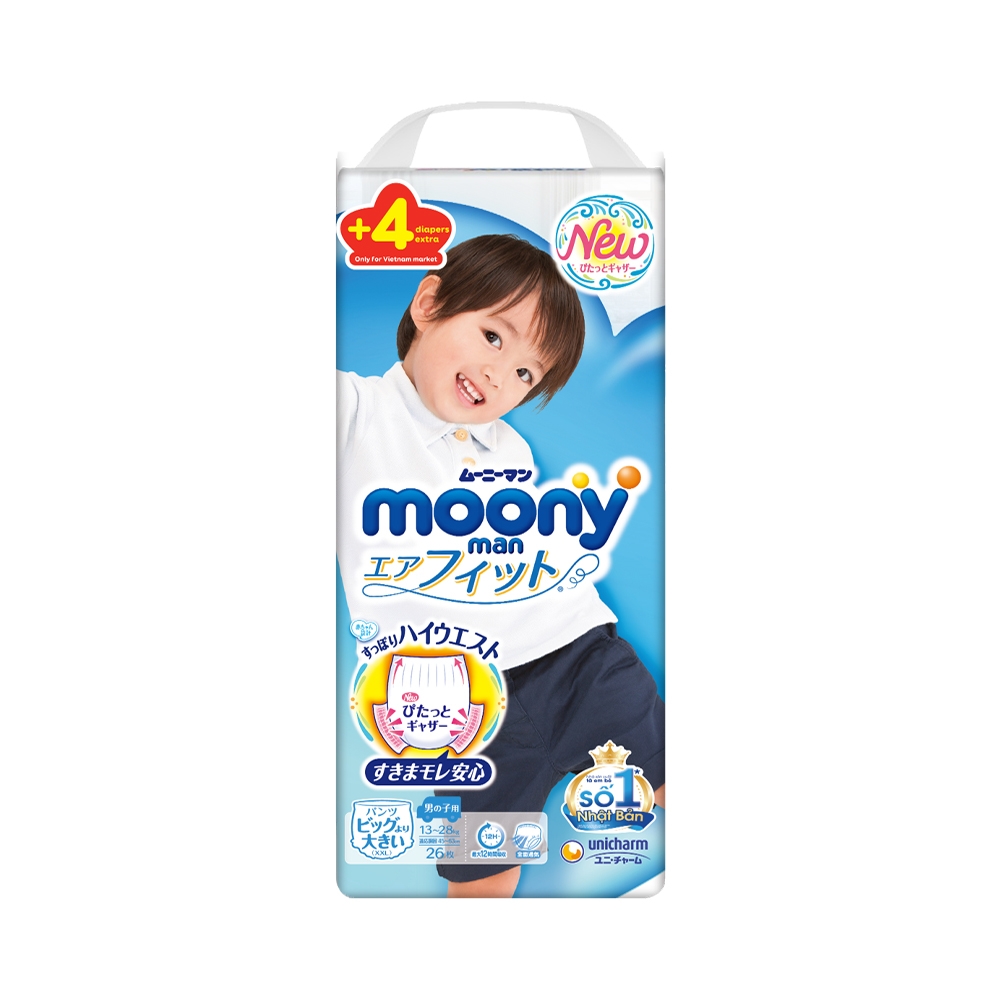 Bỉm tã quần Moony bé trai size XXL 26 miếng (+4 miếng) là loại bỉm dành cho các bé trai từ 13-28kg thuộc thương hiệu Moony nổi tiếng tại Nhật Bản, được sản xuất bởi tập đoàn Unicharm danh tiếng. Bỉm tã Moony áp dụng công nghệ hoàn toàn mới ở phần hông với màng vải thun êm mềm, co giãn tuyệt đối.