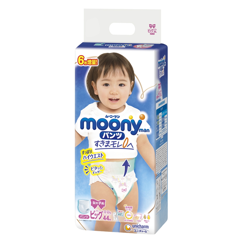 Bỉm tã quần Moony bé gái size XL 38 miếng (+6 miếng) là loại bỉm dành cho các bé gái từ 12-22kg thuộc thương hiệu Moony nổi tiếng tại Nhật Bản, được sản xuất bởi tập đoàn Unicharm danh tiếng. Bề mặt tã mềm mịn, bổ sung tinh chất dầu Olive thiên nhiên thân thiện với làn da bé, ngăn ngừa hăm tã hiệu quả.
