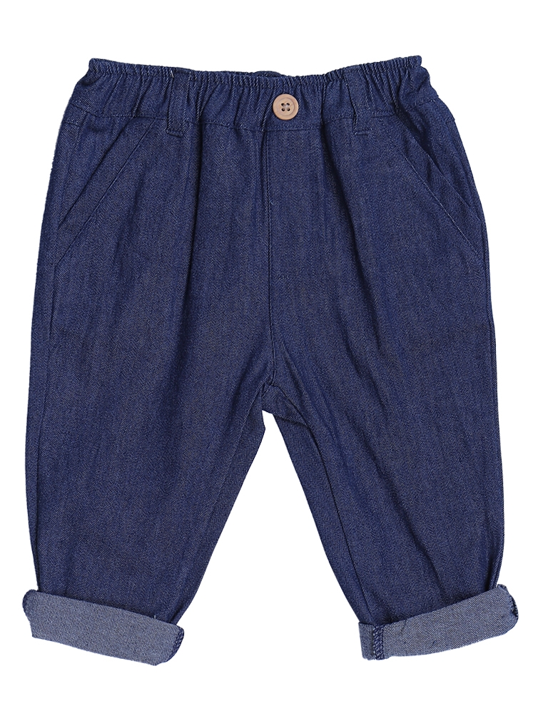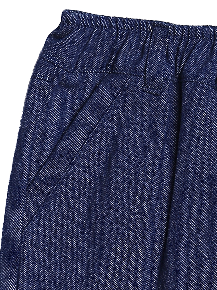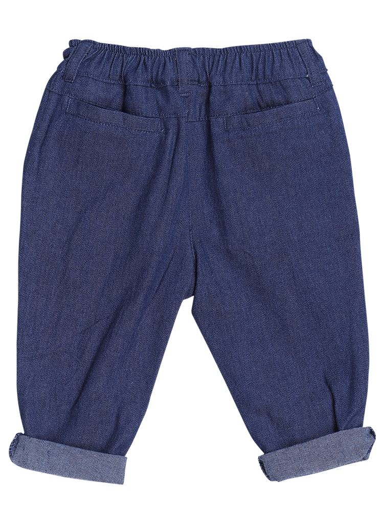 Kiểu dáng thời trang, phong cách với các đường diễu móc xích và đánh bông trang trí mới lạ trên áo. Quần giả jeans mềm, dễ mặc cho bé.