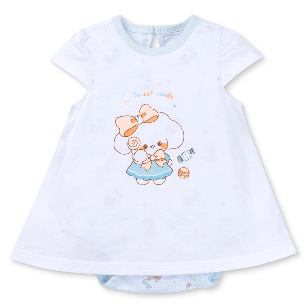 - Họa tiết "Sweet Candy" đáng yêu: Hình in nhân vật hoạt hình ngộ nghĩnh cầm kẹo mút (lollipop) cùng dòng chữ "Sweet candy" trên nền vải trắng tinh khôi tạo điểm nhấn vui tươi, trong sáng cho bé gái.