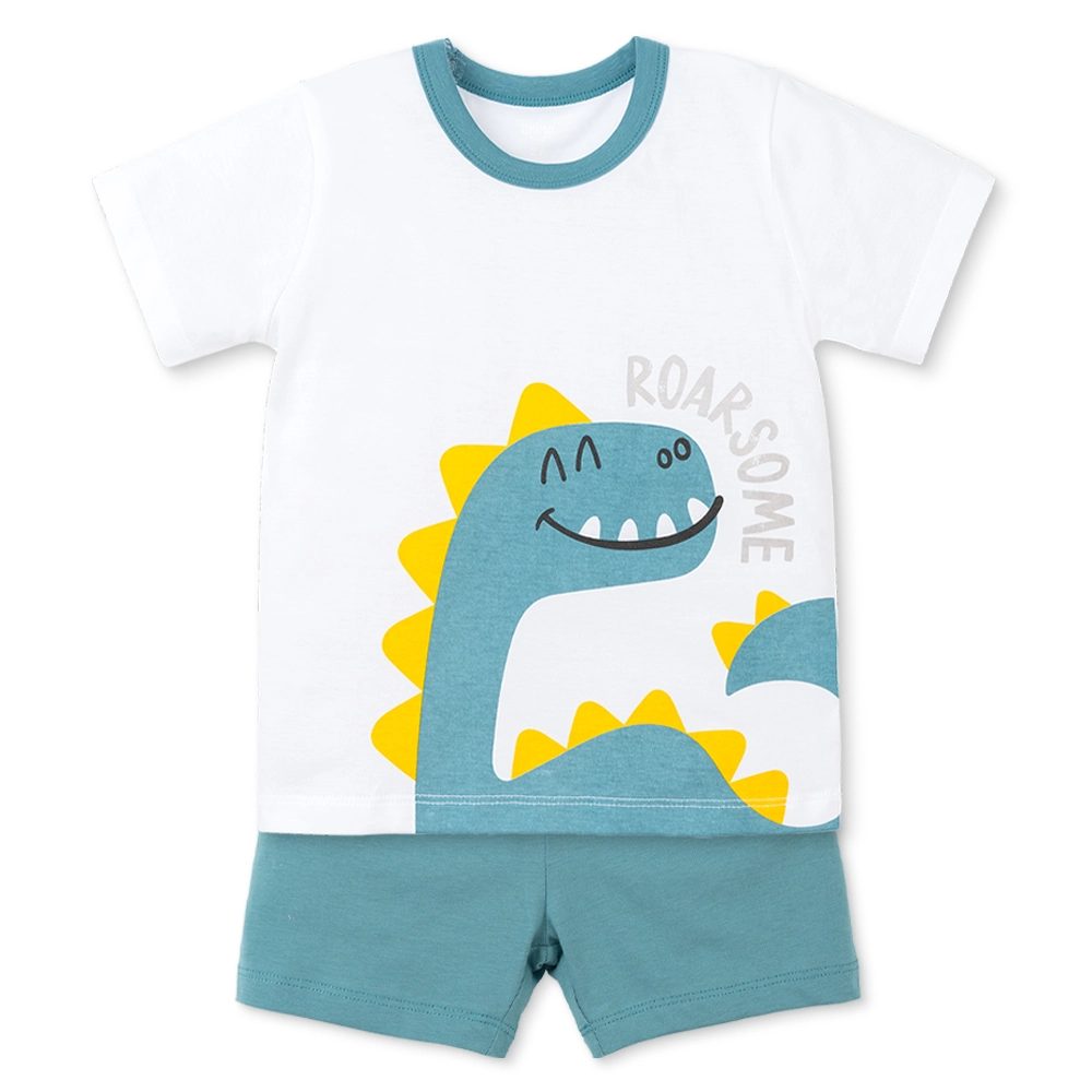 - Họa tiết Khủng long cá tính: Điểm nhấn của bộ đồ là hình in chú khủng long xanh ngộ nghĩnh cùng dòng chữ "ROARSOME" nổi bật trên nền áo trắng, mang lại vẻ ngoài tinh nghịch và khỏe khoắn cho bé trai.