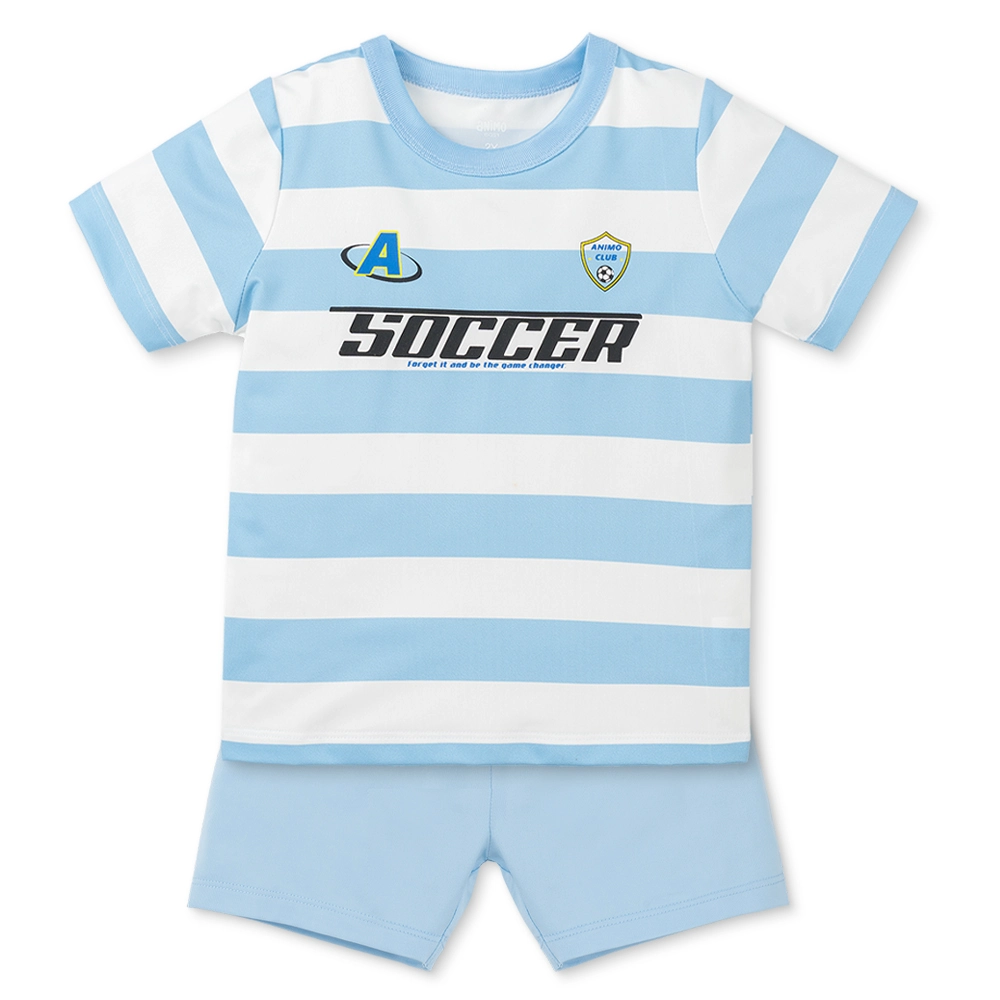 - Thiết kế đậm chất thể thao: Áo nổi bật với họa tiết kẻ sọc ngang trắng - xanh xen kẽ, kết hợp cùng dòng chữ "SOCCER" và logo "Animo Club" in sắc nét trước ngực, tạo nên phong cách "cầu thủ nhí" cực kỳ năng động.