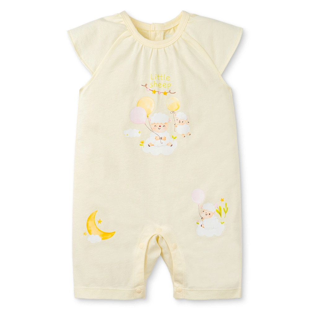 Họa tiết "Little Sheep" ngộ nghĩnh: Mặt trước áo in hình những chú cừu non trắng muốt đang cầm bóng bay, ngồi trên đám mây bồng bềnh. Kết hợp cùng hình ảnh mặt trăng lưỡi liềm và các vì sao vàng, tạo nên một bức tranh "chúc bé ngủ ngon" thật ấm áp và dễ thương.