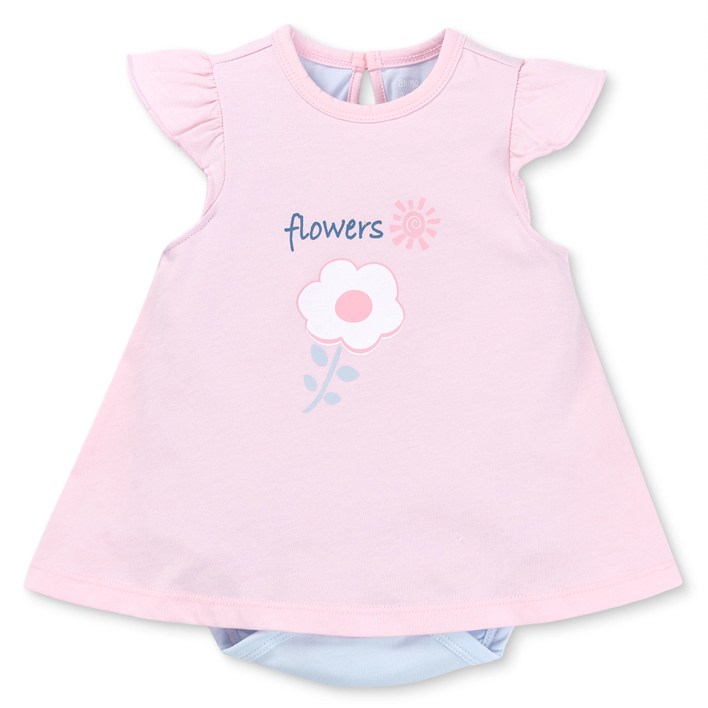 - Phối màu tinh tế: Sự kết hợp giữa tông màu hồng phấn chủ đạo của phần váy và màu xanh nhạt dịu mát của phần body bên dưới tạo nên sự hài hòa, bắt mắt và rất tôn da bé.