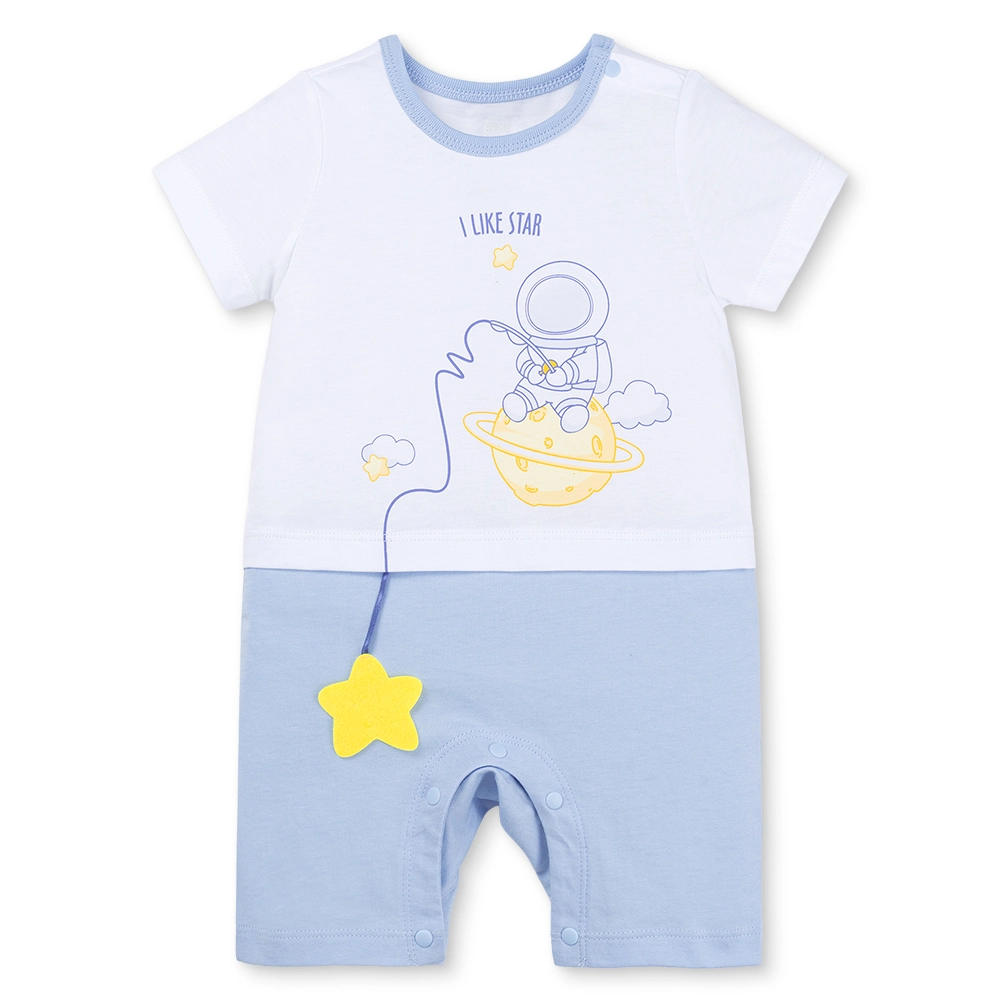 Thiết kế "Câu sao" 3D độc đáo: Điểm đặc biệt nhất của bộ đồ là hình in chú phi hành gia ngồi trên hành tinh đang cầm cần câu, với dây câu nối liền một ngôi sao vàng bằng vải nỉ nổi 3D lắc lư bên ngoài. Chi tiết này không chỉ đẹp mắt mà còn thu hút sự chú ý, kích thích xúc giác của bé.