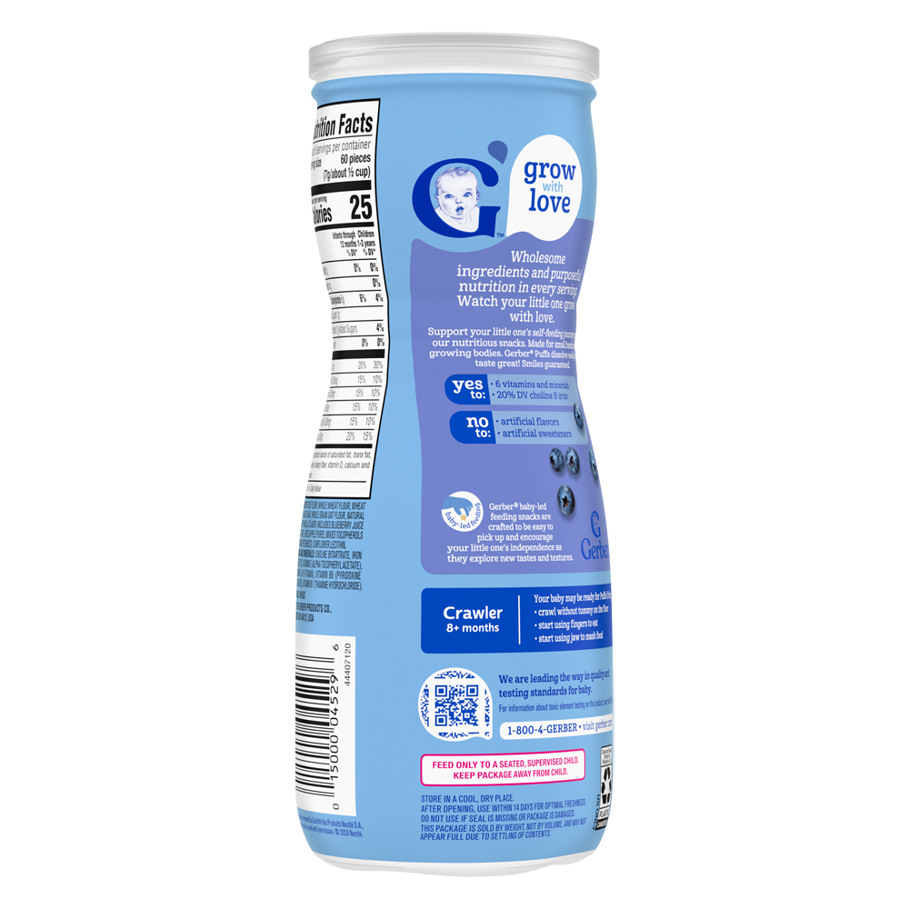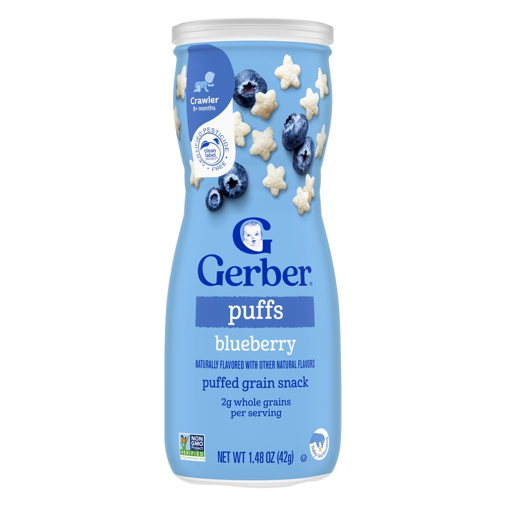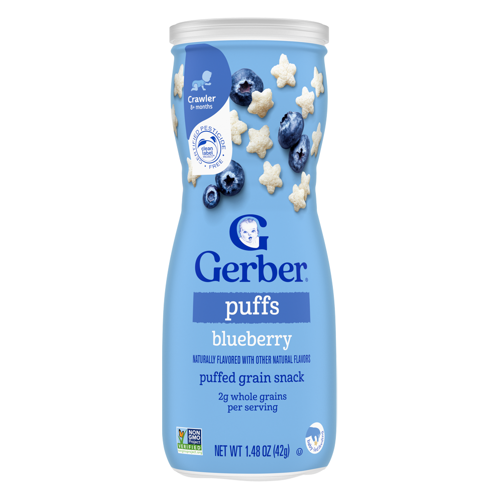 Thực phẩm bổ sung Bánh ăn dặm Gerber Puffs vị việt quất với kết cấu giòn tan, hương vị tự nhiên kích thích vị giác bé, hình dáng vừa vặn cho con càng thêm thích thú khám phá, phát triển kỹ năng đầu đời như cầm-bốc-nhai.