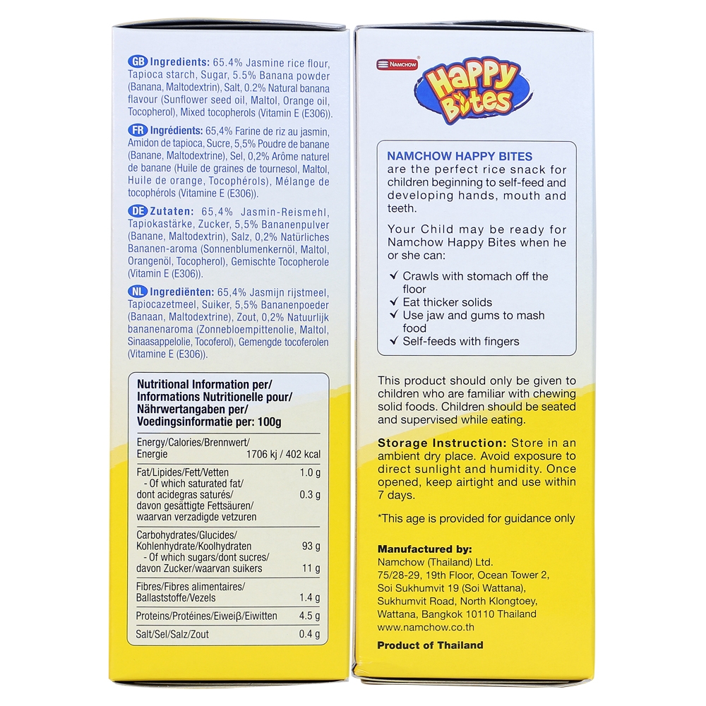 Bột gạo jasmine 65.4%, tinh bột bắp, bột chuối 5.5%, muối, đường, hương vị chuối tự nhiên 0.2% (dầu hạt hướng dương, maltol, dầu cam, tocopherol), mixed tocopherols (vitamin e (e306))