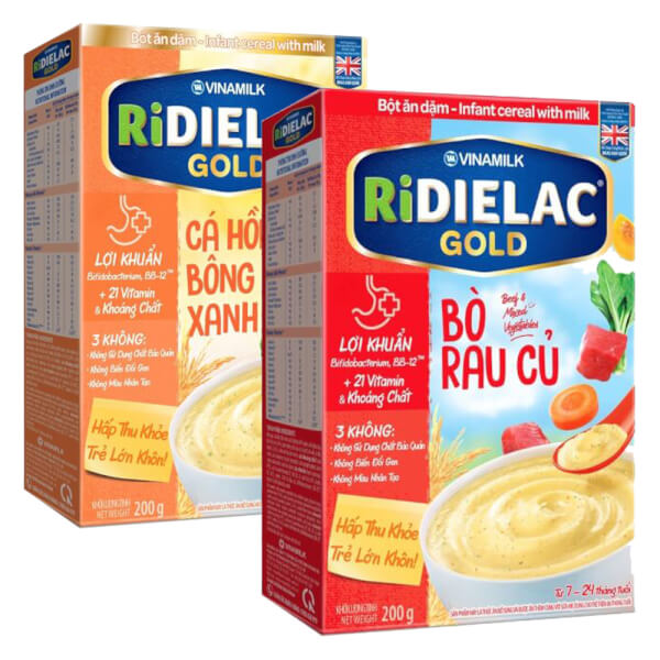 Combo 2 Bột ăn dặm RIDIELAC GOLD Bò rau củ HG 200g và Cá hồi bông cải xanh HG 200g