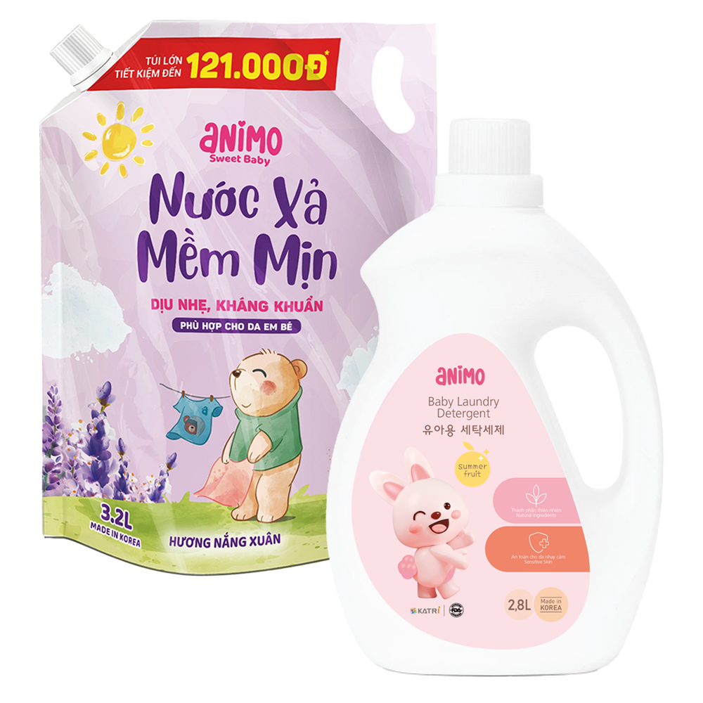 Combo 1 Nước xả dịu nhẹ kháng khuẩn lưu hương Animo hương Nắng Xuân 3.2L (Tím) và 1 Nước giặt cho bé Animo hương trái cây mùa hè chai 2,8L