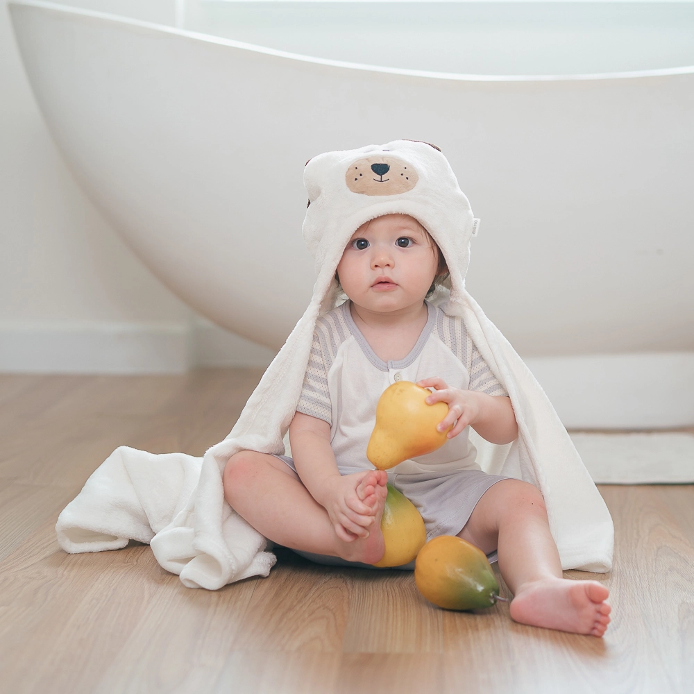 Được làm từ chất liệu sợi cotton và có khả năng thấm nước tốt, áo choàng tắm thường được dùng giữ ấm cho bé sau khi tắm. Đặc biệt, thiết kế khăn có kèm mũ giúp che đầu, giữ ấm và bảo vệ thóp cho bé. Phần áo choàng giúp tránh cho phần vai và đầu bé bị hở, hạn chế tối đa cảm lạnh và các vấn đề về đường hô hấp. Tuy nhiên, ba mẹ nên tránh sử dụng loại khăn này quấn cho bé khi ngủ vì phần mũ có thể che đầu và mặt của con.