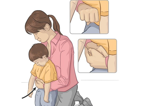 - Dị vật đường thở: Ba mẹ cần cố gắng tống xuất dị vật ra ngoài. Ví dụ, trẻ dưới 2 tuổi có thể sử dụng phương pháp vỗ lưng ấn ngực, trẻ 2 tuổi có thể áp dụng phương pháp heimlich. Cụ thể, ba mẹ hãy đứng sau lưng trẻ, vòng hai tay ôm lấy thắt lưng trẻ, rồi nắm chặt bàn tay làm thành một quả đấm đặt ở vùng thượng vị, ngay dưới chóp xương ức, phía trên rốn. Tiếp đó, ba mẹ hãy ấn 5 cái dứt khoát theo hướng từ trước ra sau và từ dưới lên trên, mạnh và nhanh. Có thể lặp lại 6-10 lần ấn bụng cho tới khi dị vật rơi khỏi đường thở hoặc trẻ khóc la được.