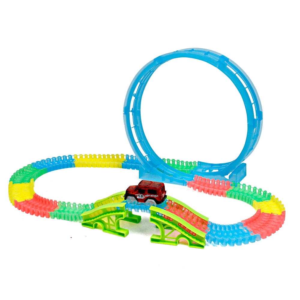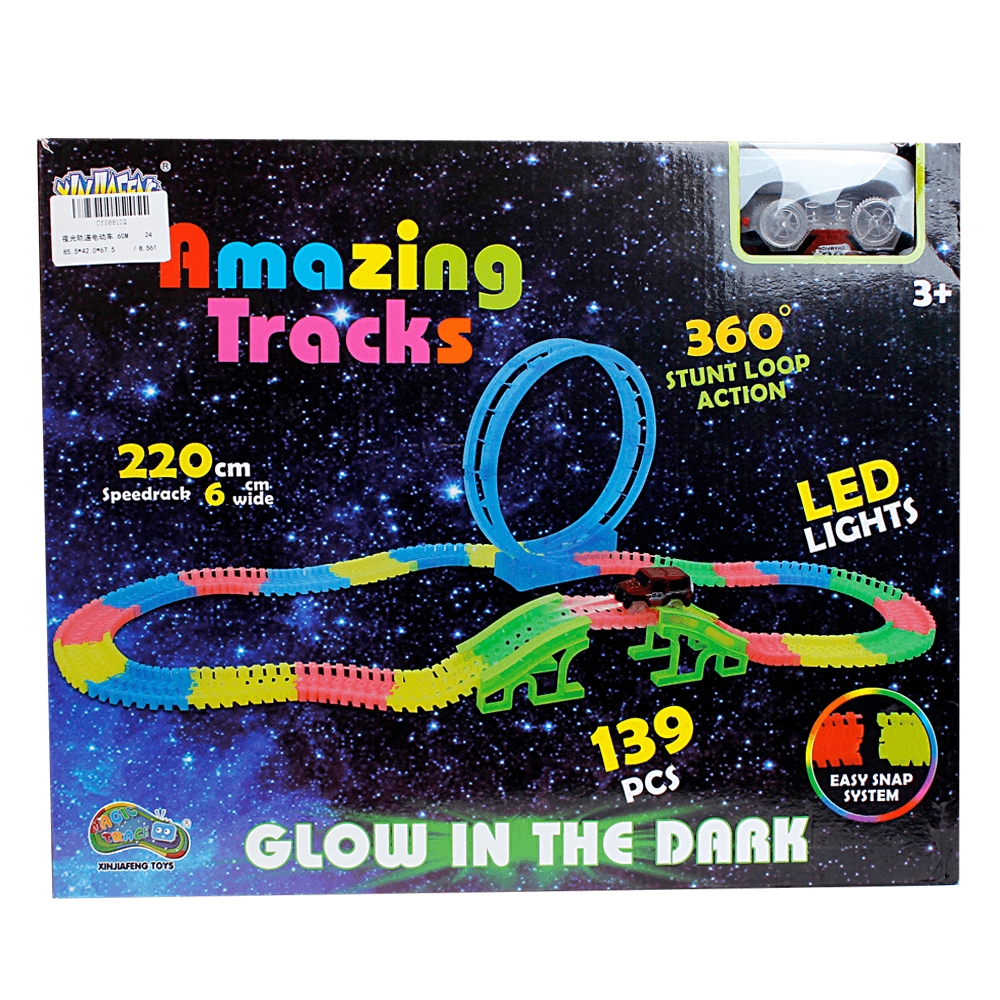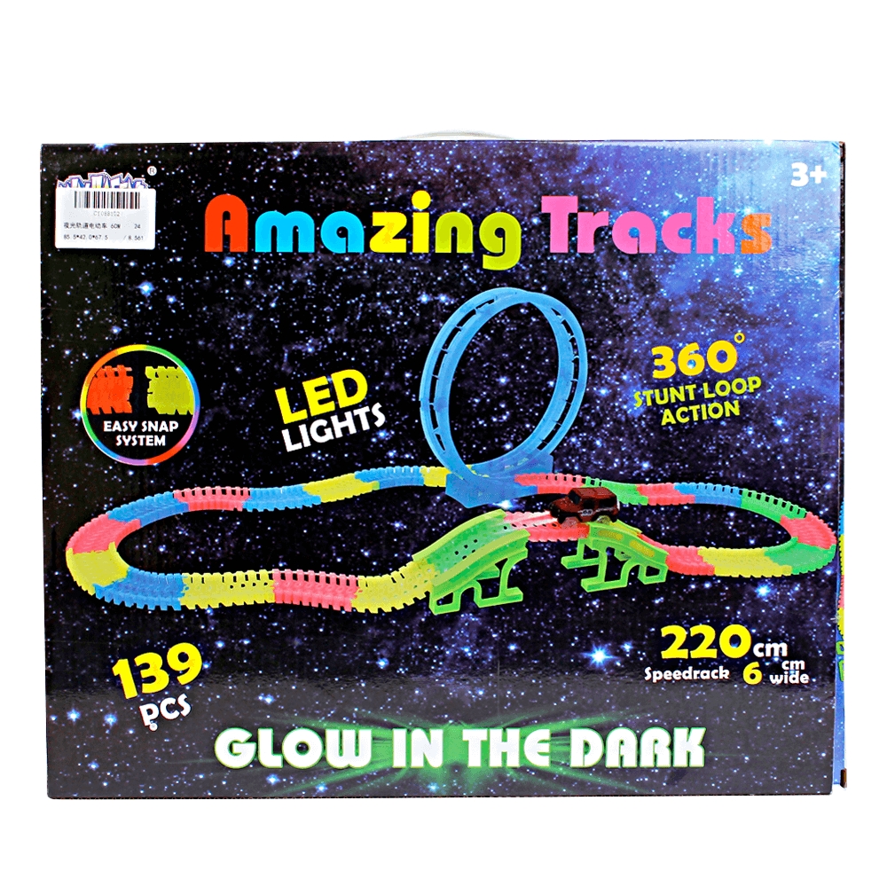 - Bộ đường ray bao gồm: 139 mảnh ghép đường ray, 1 xe, xe có 3 đèn led phát sáng, chiều dài và độ rộng đường ray 220cm - 6cm.