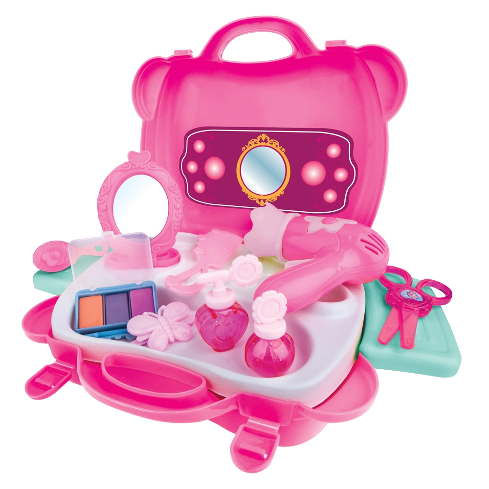 . Đồ chơi bao gồm 13 chi tiết được mô phỏng chân thật như: lược, kéo, gương, phấn mắt, nước hoa, máy sấy tóc,... làm tăng cảm giác thích thú của bé khi chơi;