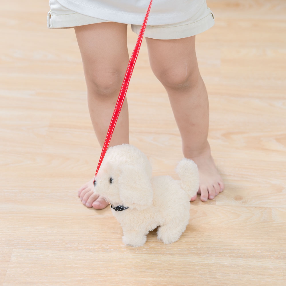 Lắp pin và bật công tắc để bé chó đi và phát nhạc. Bé có thể đeo dây để dẫn nó đi dạo.