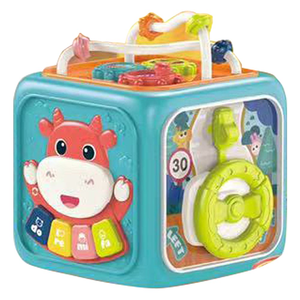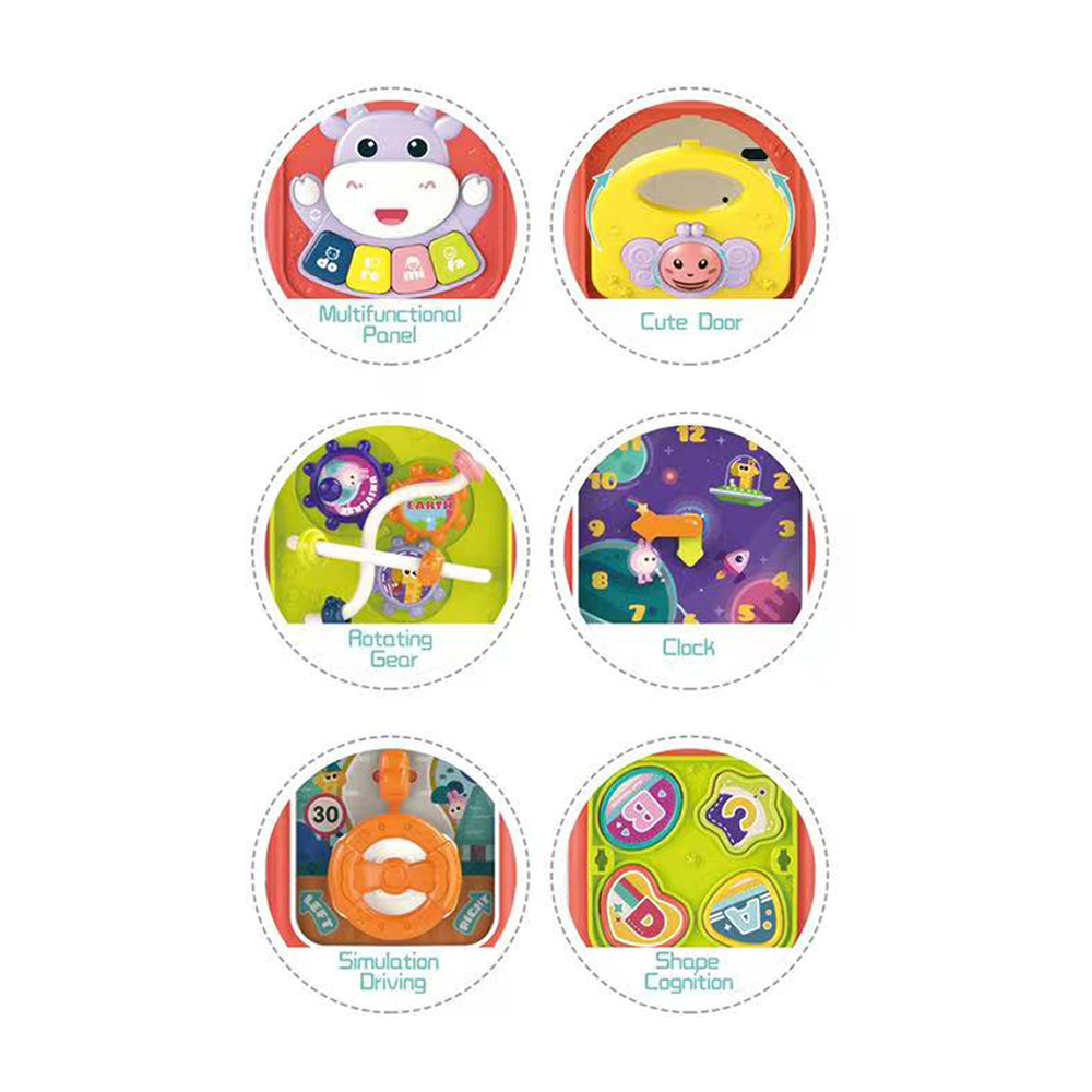 . Thiết kế 6 trong 1 đa năng bao gồm: đàn phát nhạc, cửa đóng mở, luồn hạt, đồng hồ, tay lái, thả khối;