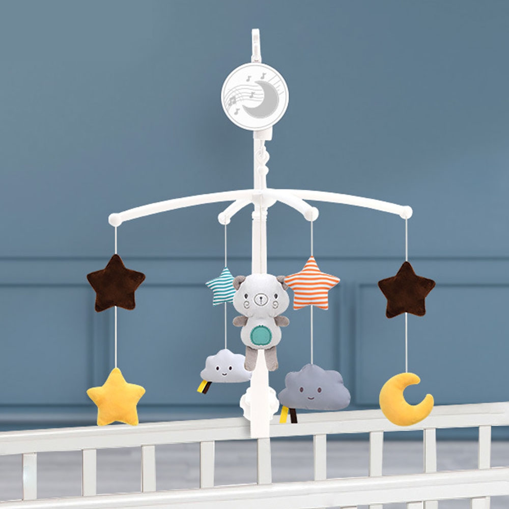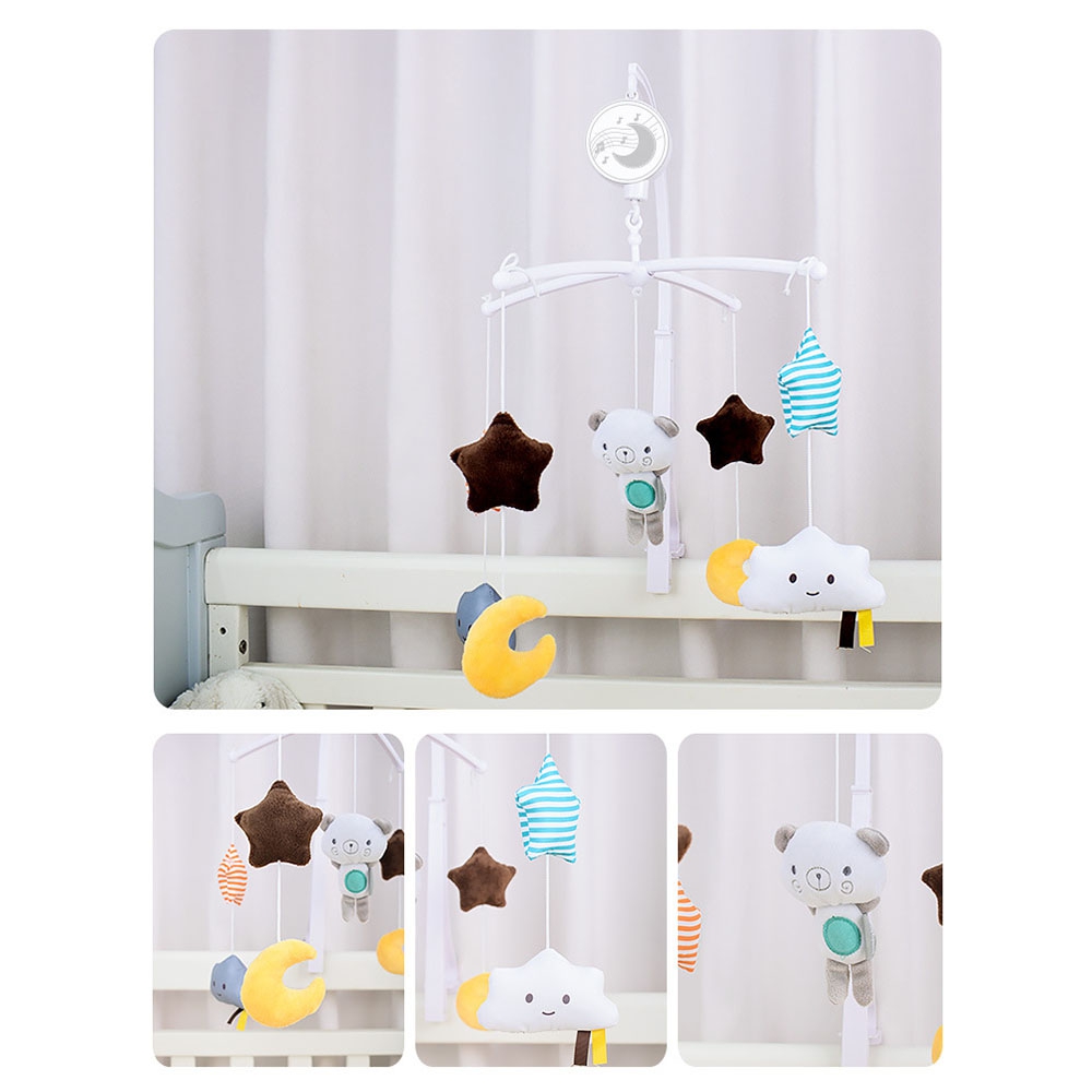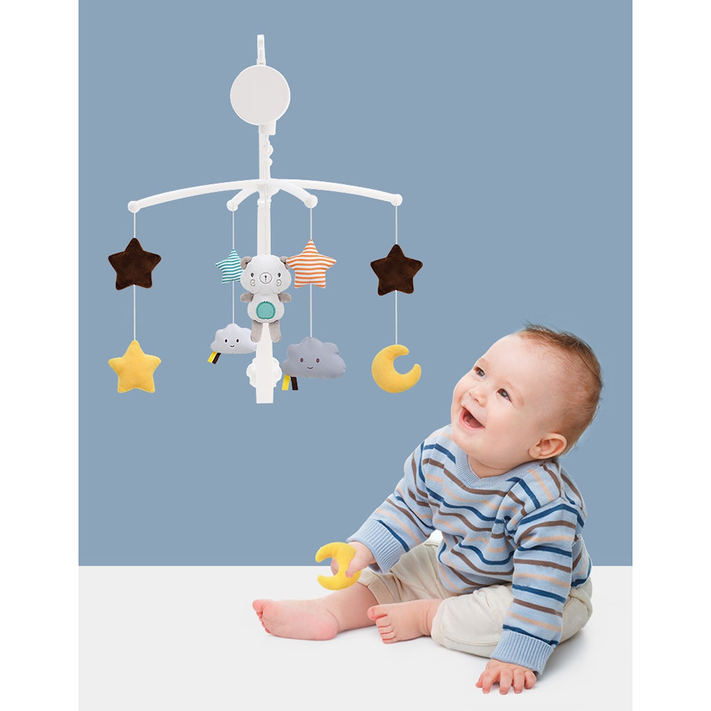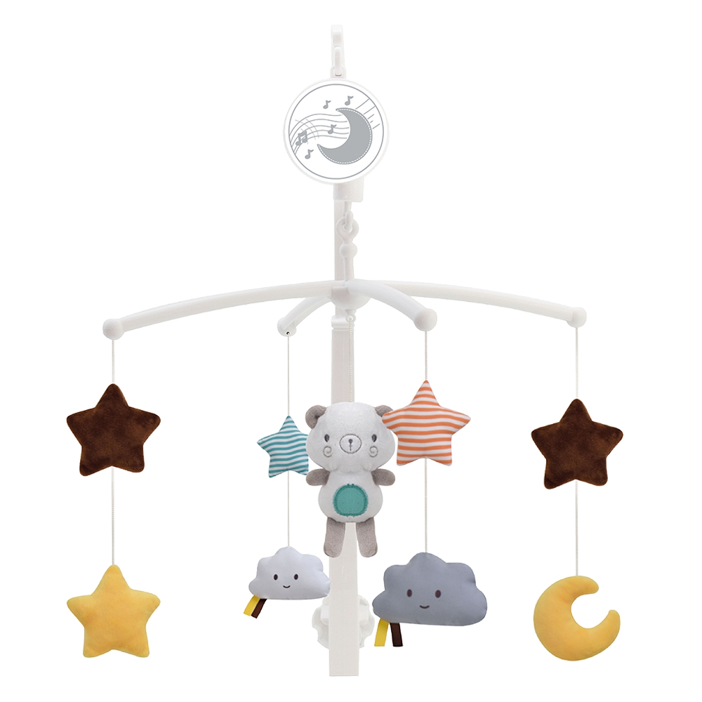 Lắp khung kệ cố định vào nôi của bé ở vị trí phù hợp cho bé và treo thú bông vào. Bật công tắc trên cục nhạc để phát nhạc và xoay.