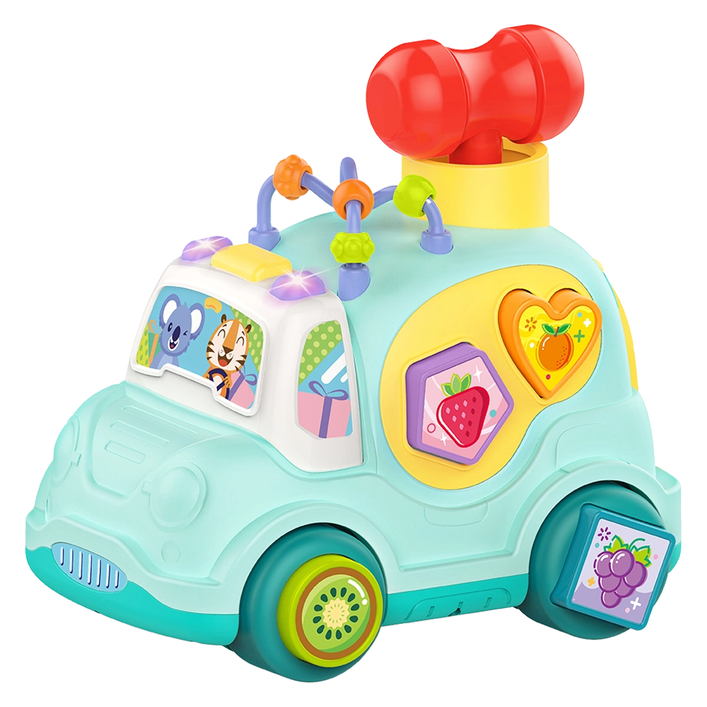 . Thân xe có nhiều trò chơi nhỏ để bé khám phá như: đập bóng, chuyền hạt, lắp hình khối, chơi xe,...;