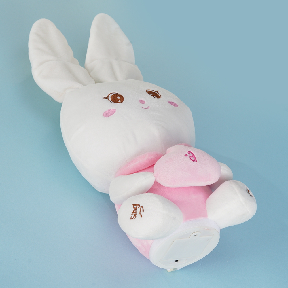 . Lắp pin vào sản phẩm, sau đó nhấn nút ở chân, chú thỏ sẽ hát và chơi ú òa.