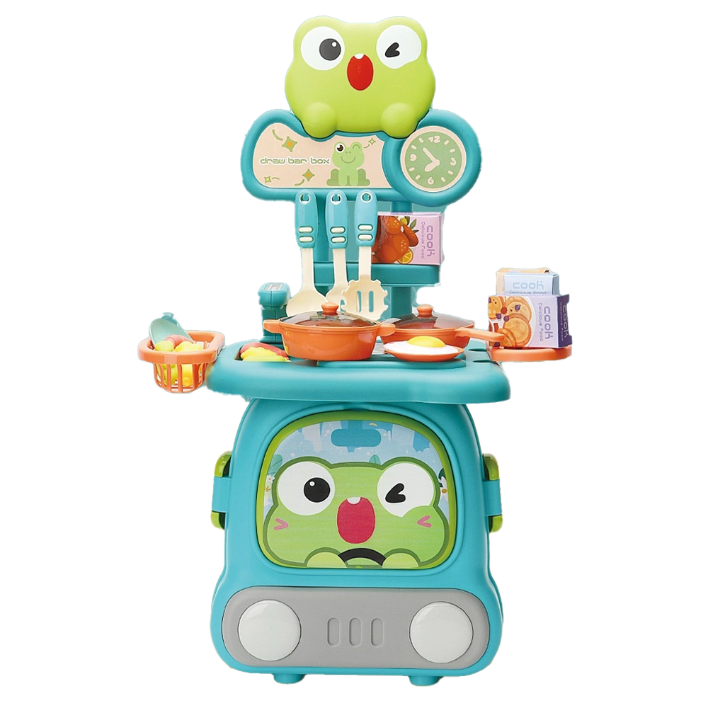 . Bộ đồ chơi bao gồm các dụng cụ nhà bếp nhỏ xinh như: chảo, nồi, rau, dĩa, muỗng,...;