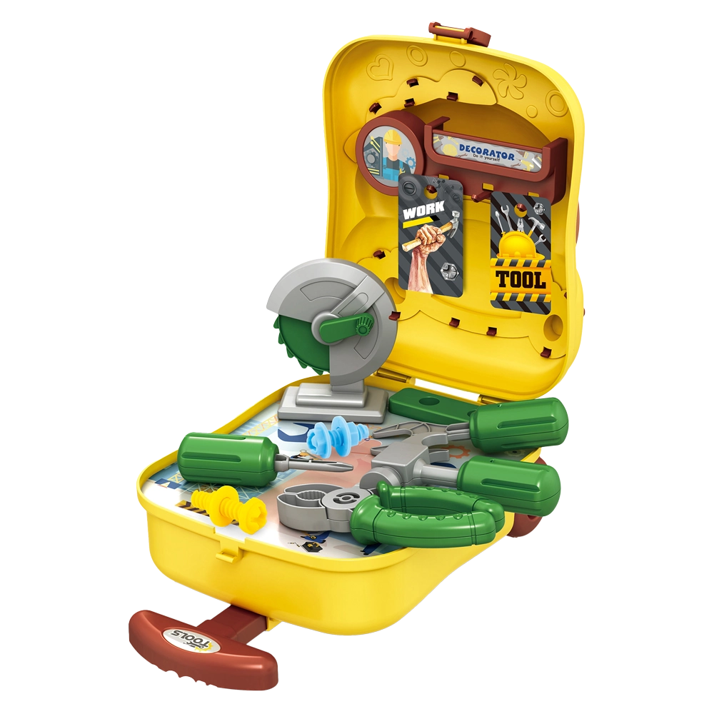 Bé mở vali và chơi nhập vai công cụ với các dụng cụ bên trong.