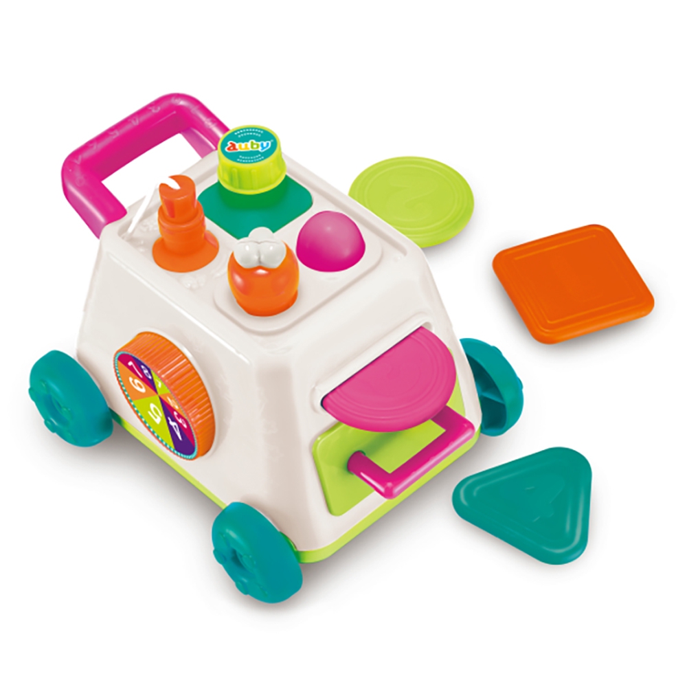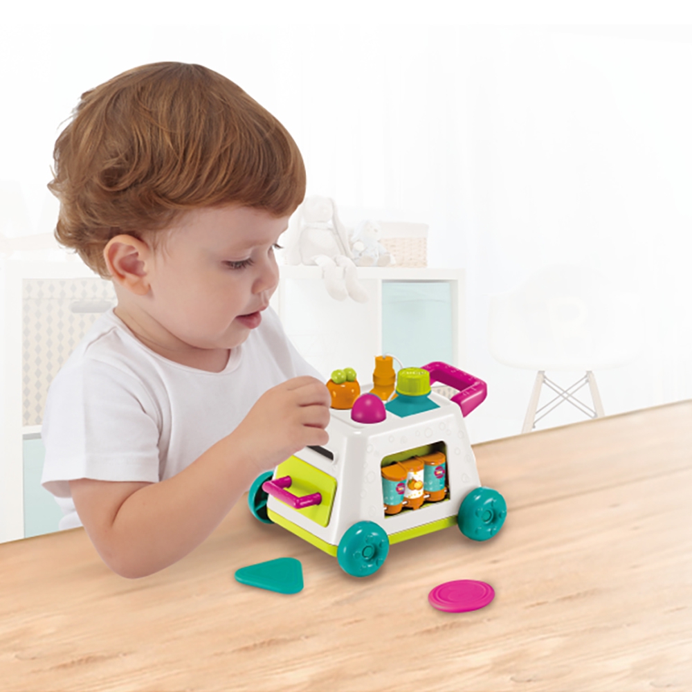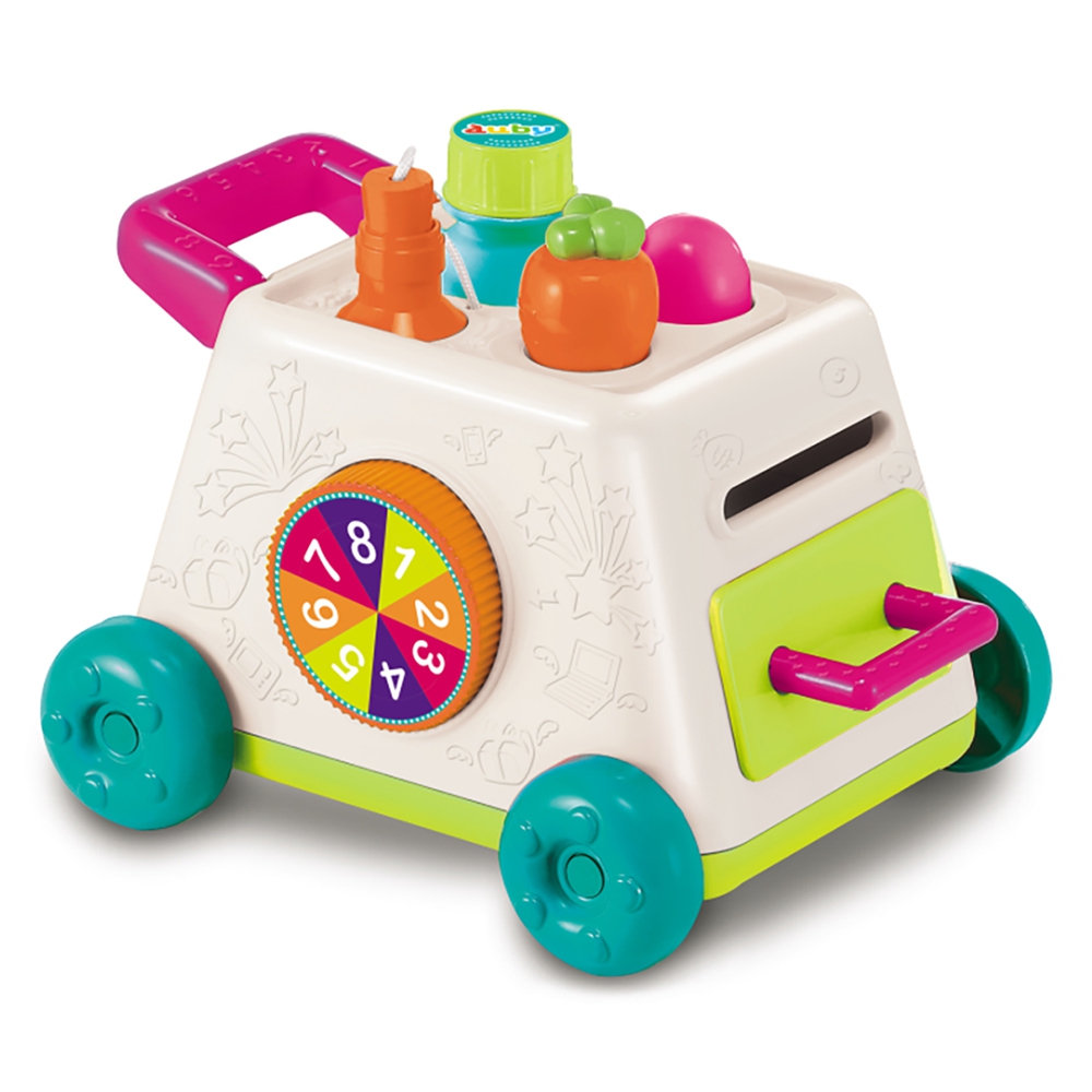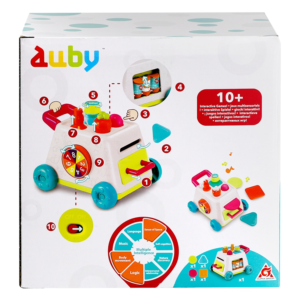 1. Phía trên đầu xe bé chơi bằng cách kéo, nhấn, xoay các đồ chơi củ cải, trứng,… Bên hông xe có nút xoay 360 độ phát ra âm thanh. Mặt còn lại giúp bé luyện tập kỹ năng ngón tay bằng cách kéo thanh đồ chơi ra, đồ chơi sẽ bật lại vào vị trí ban đầu.